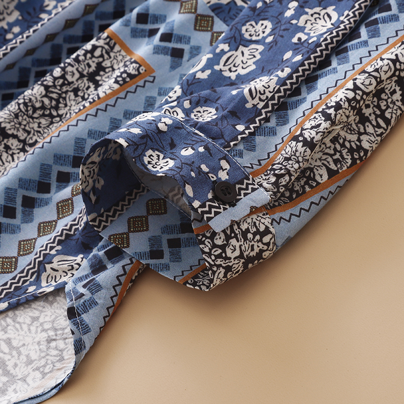 夏季复古时尚印花短袖衬衫绵绸上衣 中长款微胖七分袖子遮臀薄款