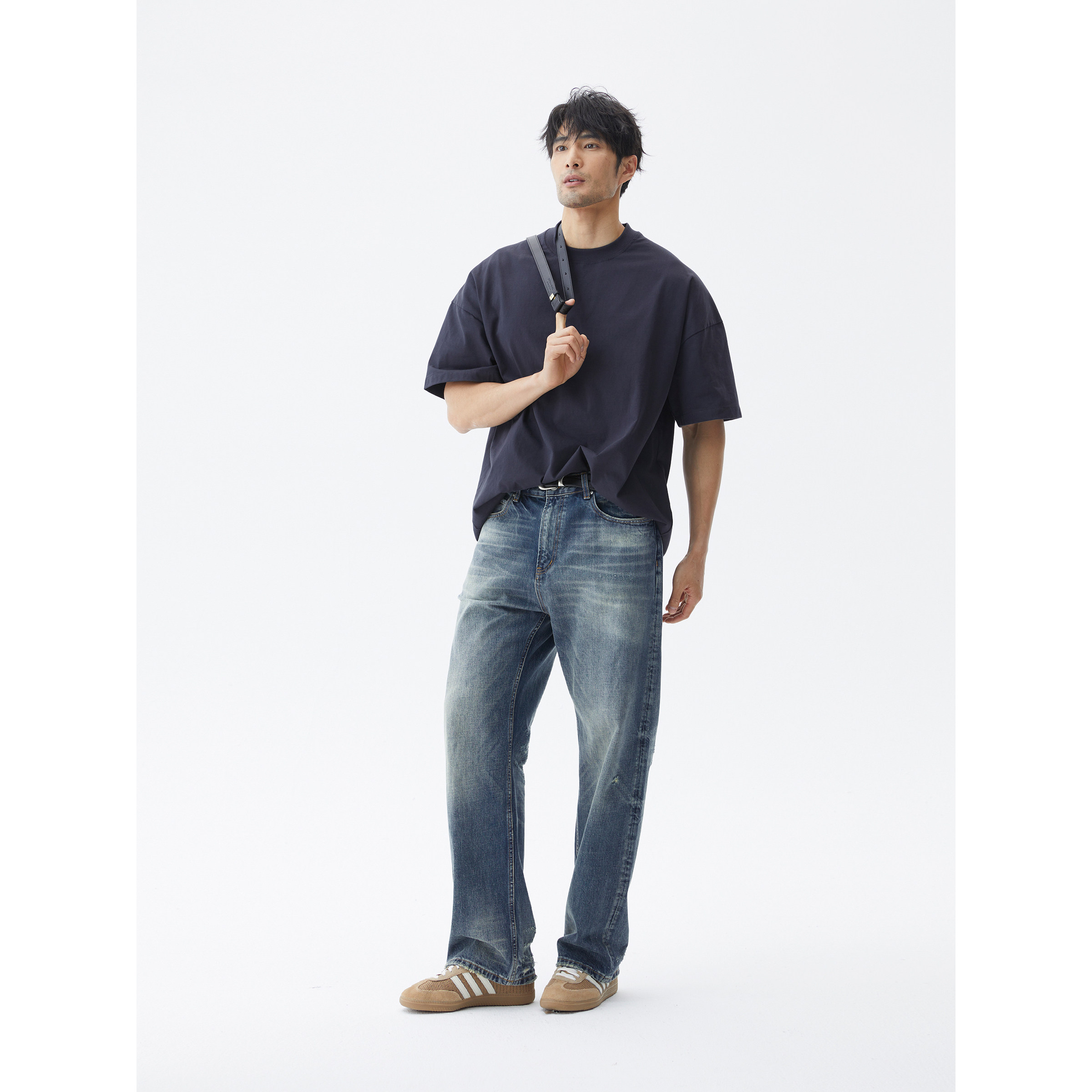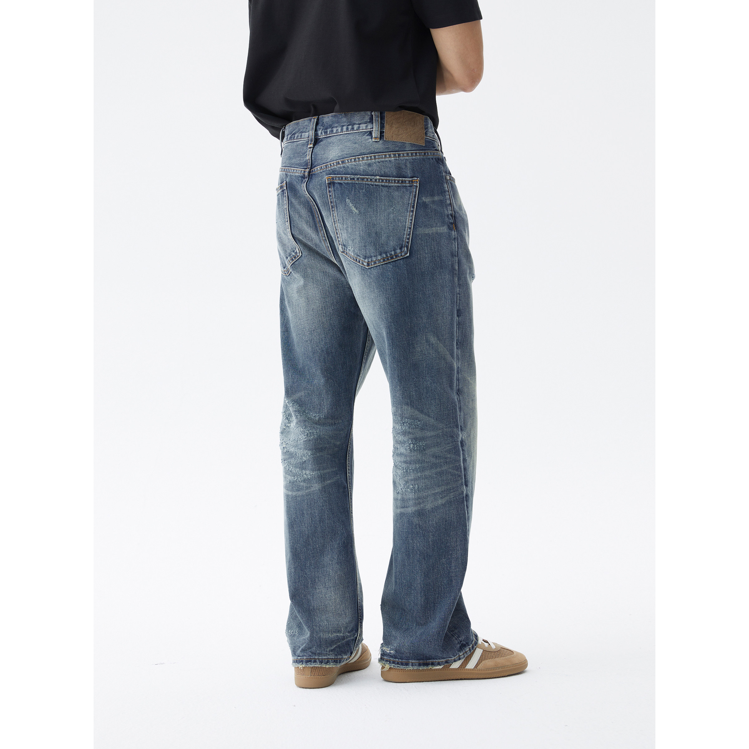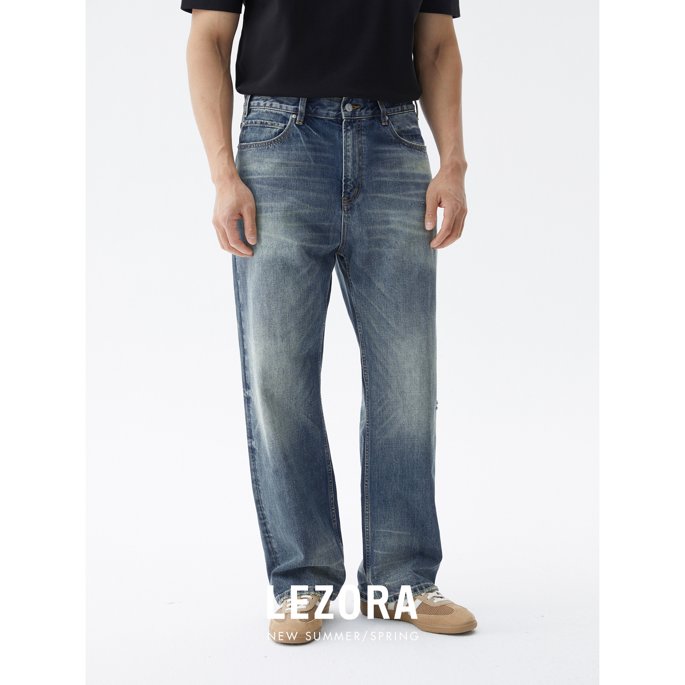 LEZORA vintage水洗破坏!13.5oz斜纹全棉丹宁大直筒牛仔裤男D91