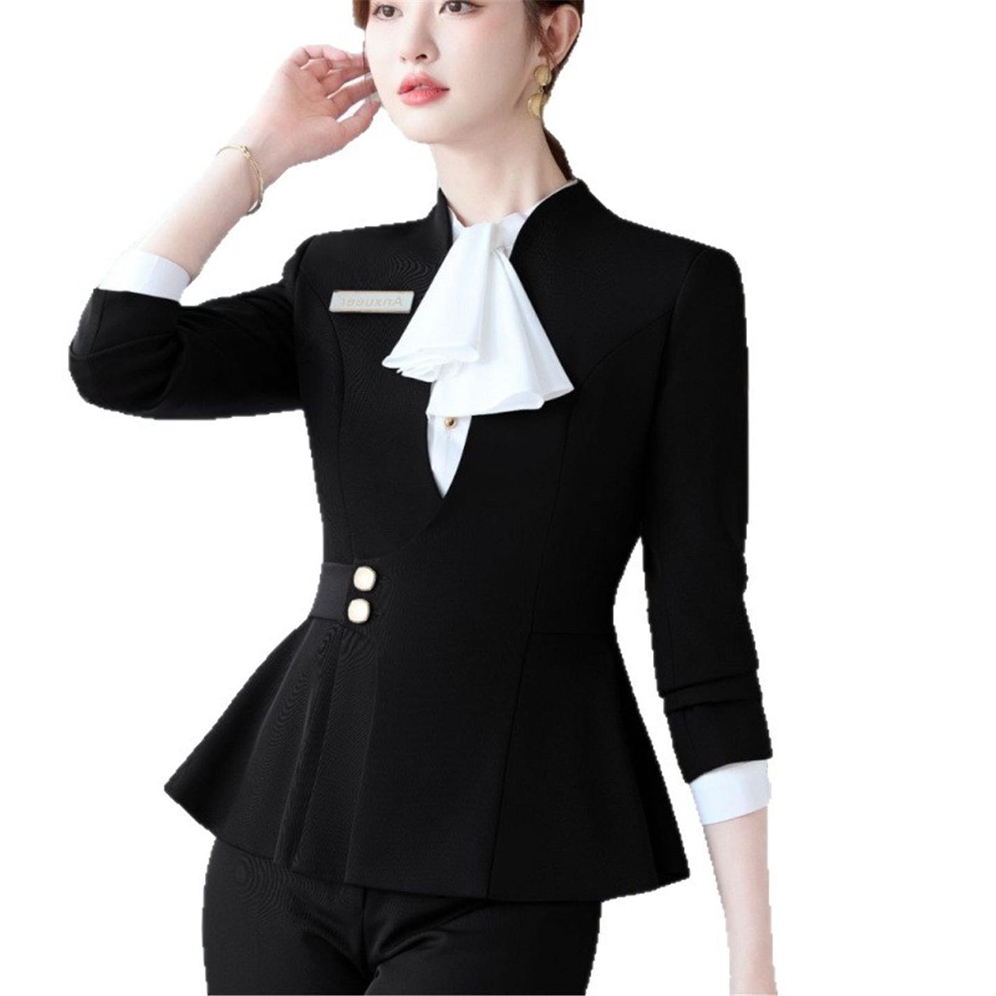 秋冬职业美容院女足疗馆西装套装酒红色前台接待无领三件套工作服