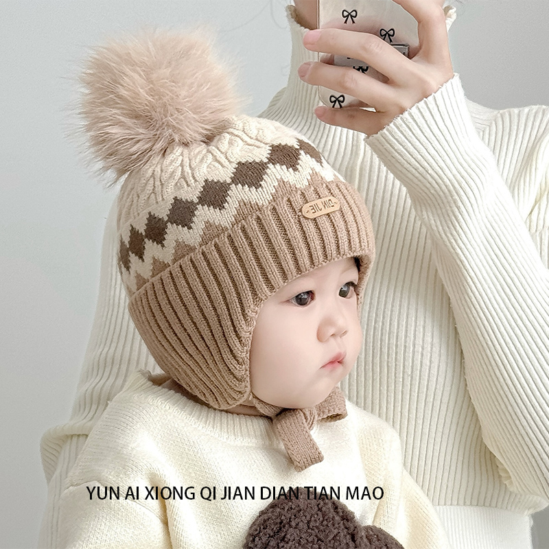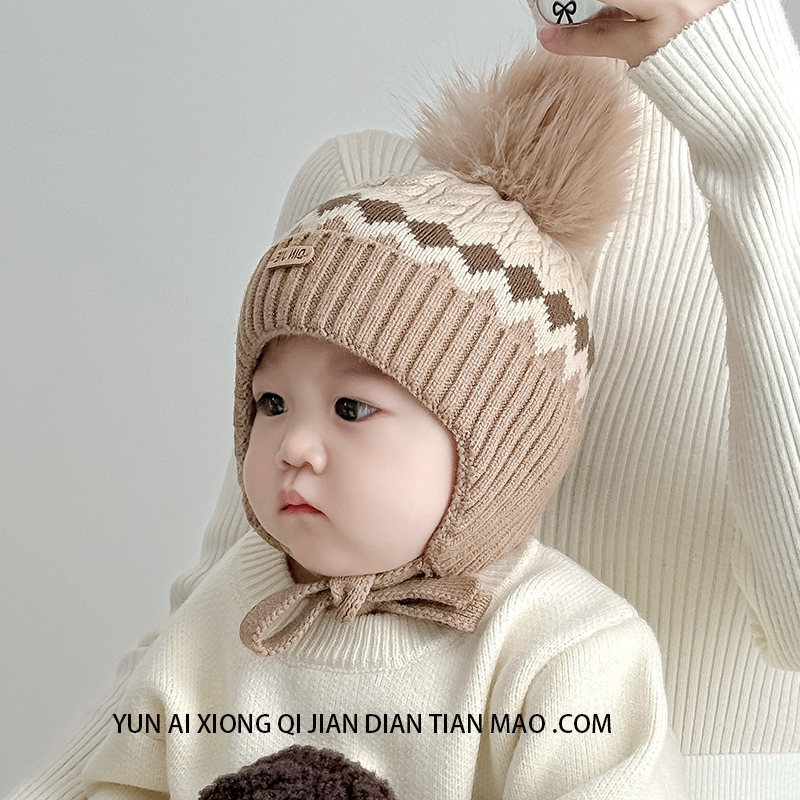 宝宝帽子秋冬季韩版男女童套头毛线帽儿童加厚保暖婴儿护耳帽毛球