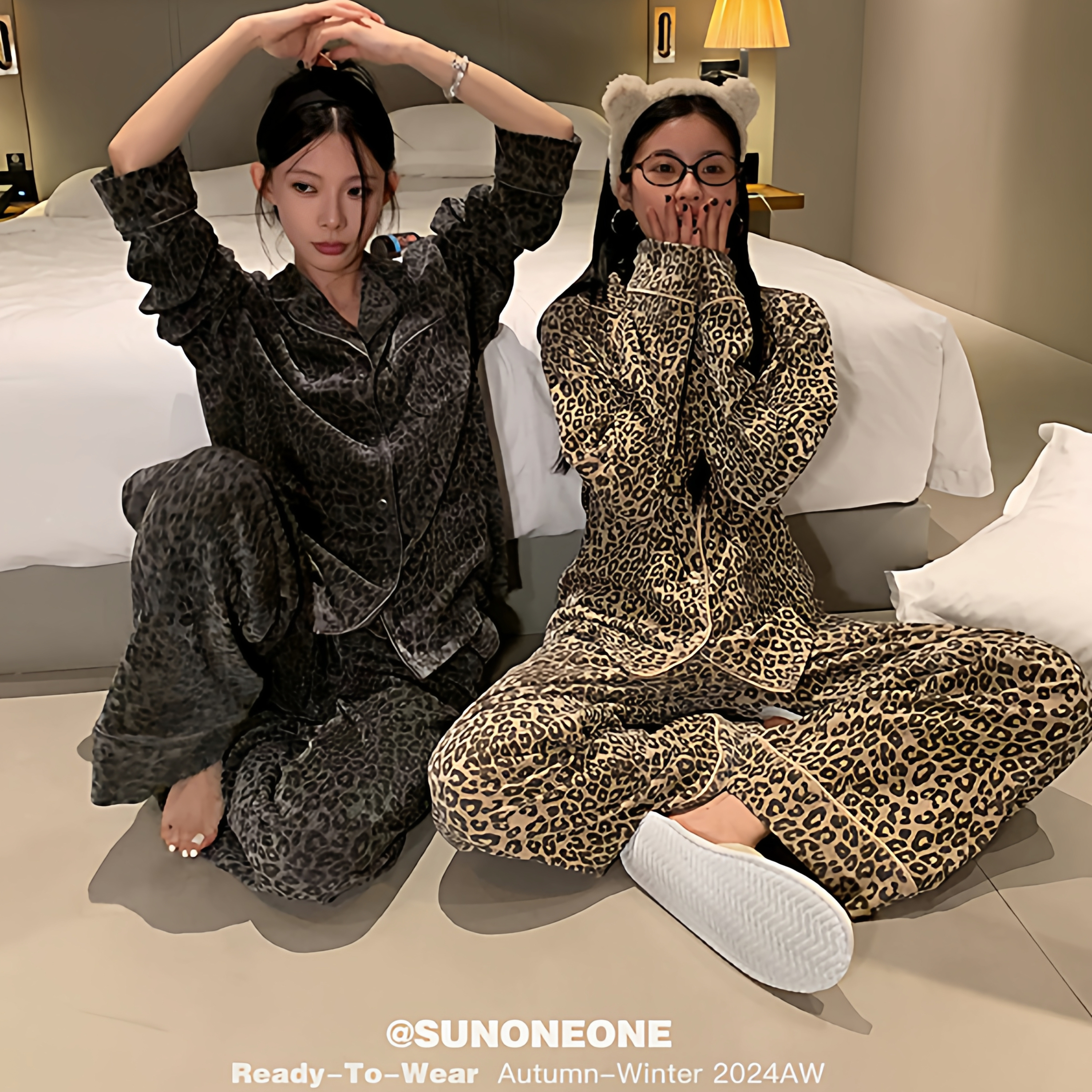 轻奢豹纹德绒睡衣女秋冬季2025新款高级感情侣长袖春秋家居服套装
