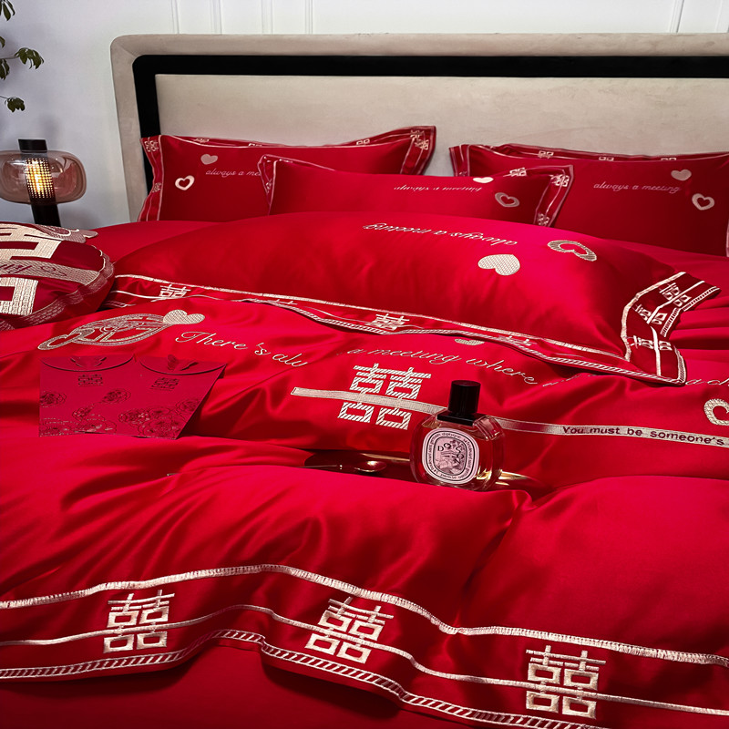 欧式刺绣婚庆四件套大红色床单被套全棉中式结婚床上用品