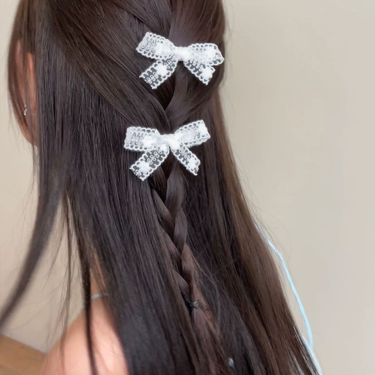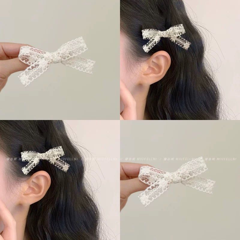 温柔少女刘海蕾丝蝴蝶结鸭嘴夹奶白色侧边夹百搭发饰马尾配饰发夹