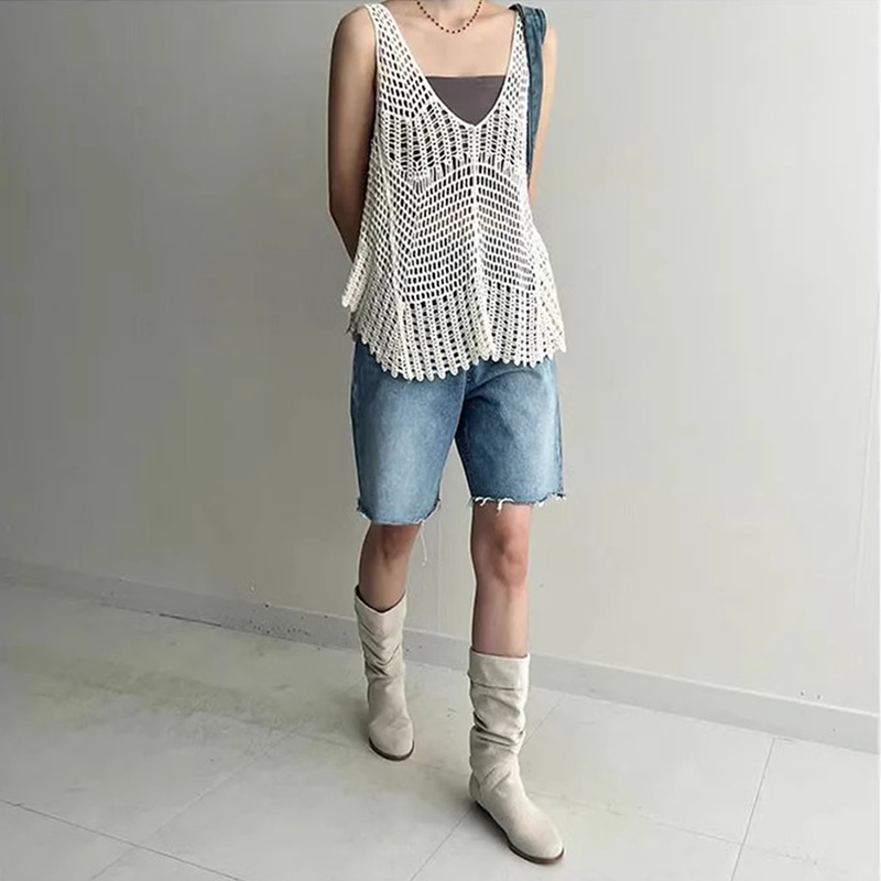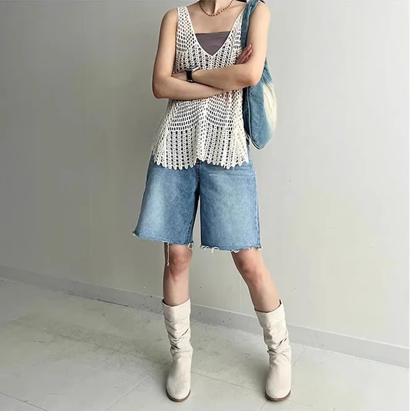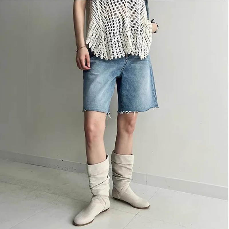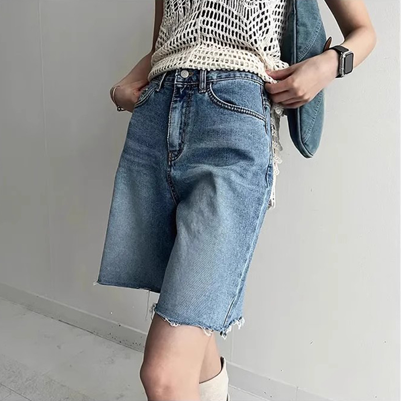 良良家水洗五分牛仔裤女夏季新款高腰显瘦宽松毛边直筒裤休闲短裤