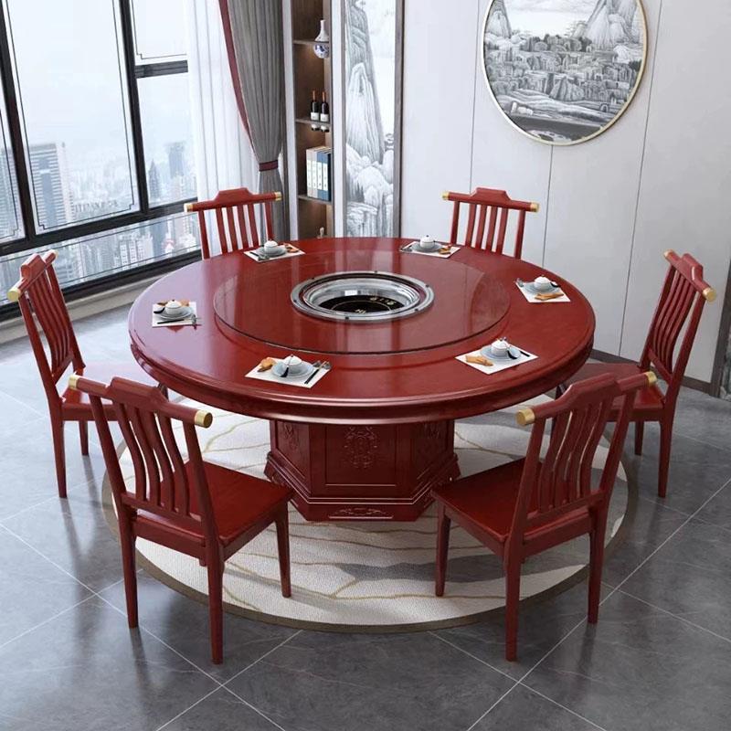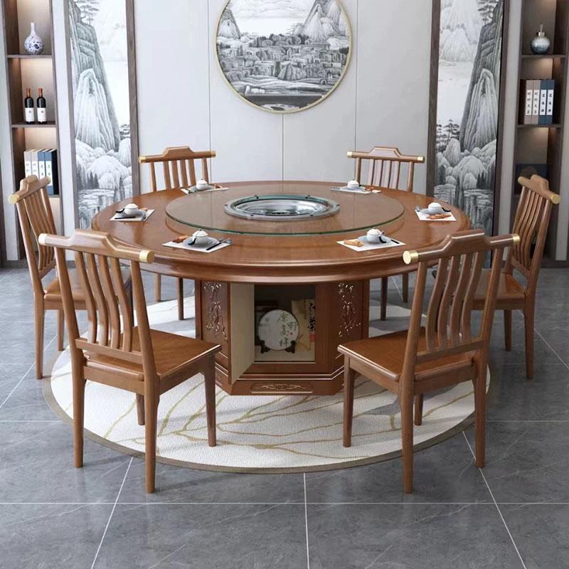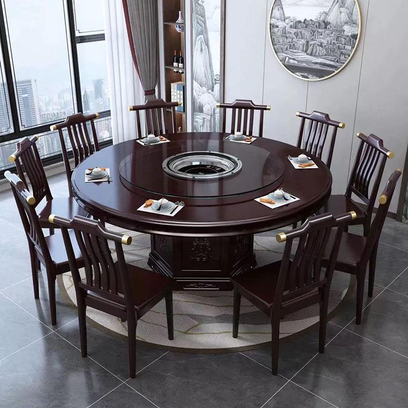 下沉式电磁炉火锅桌新中式实木圆形餐桌椅家用饭店用10人吃饭桌子