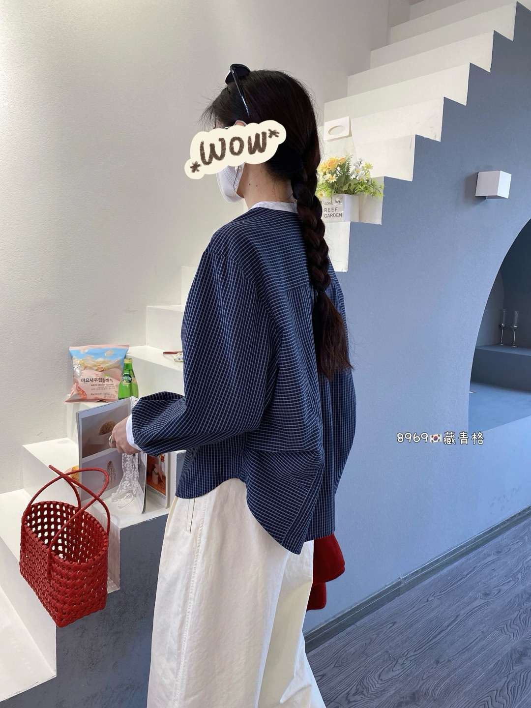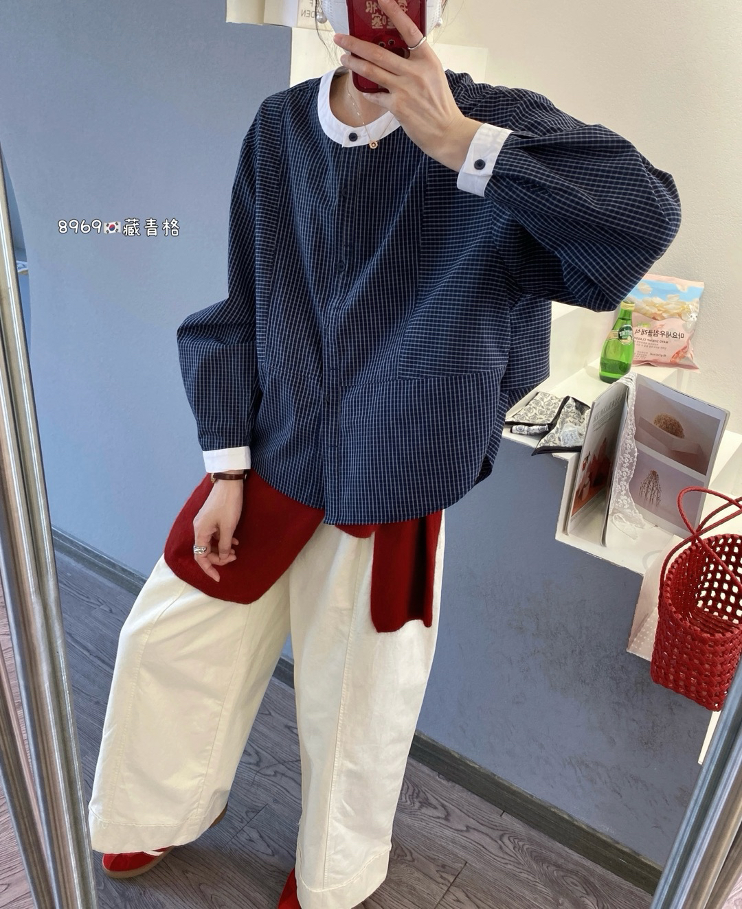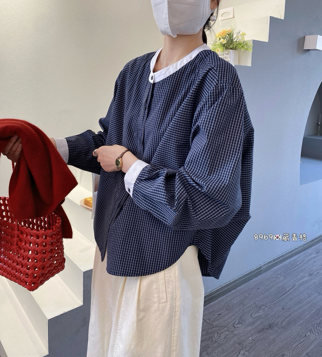 YOYO-新款纯棉相色条纹龟背款长袖衬衫女韩系宽松上衣潮款