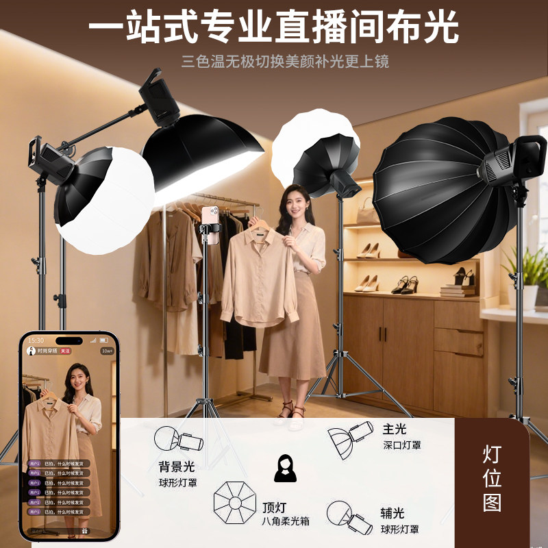 专业直播补光灯主播专用美颜视频拍照灯光设备直播间led球形背景氛围灯光室内影棚人像服装摄影灯拍摄打光灯