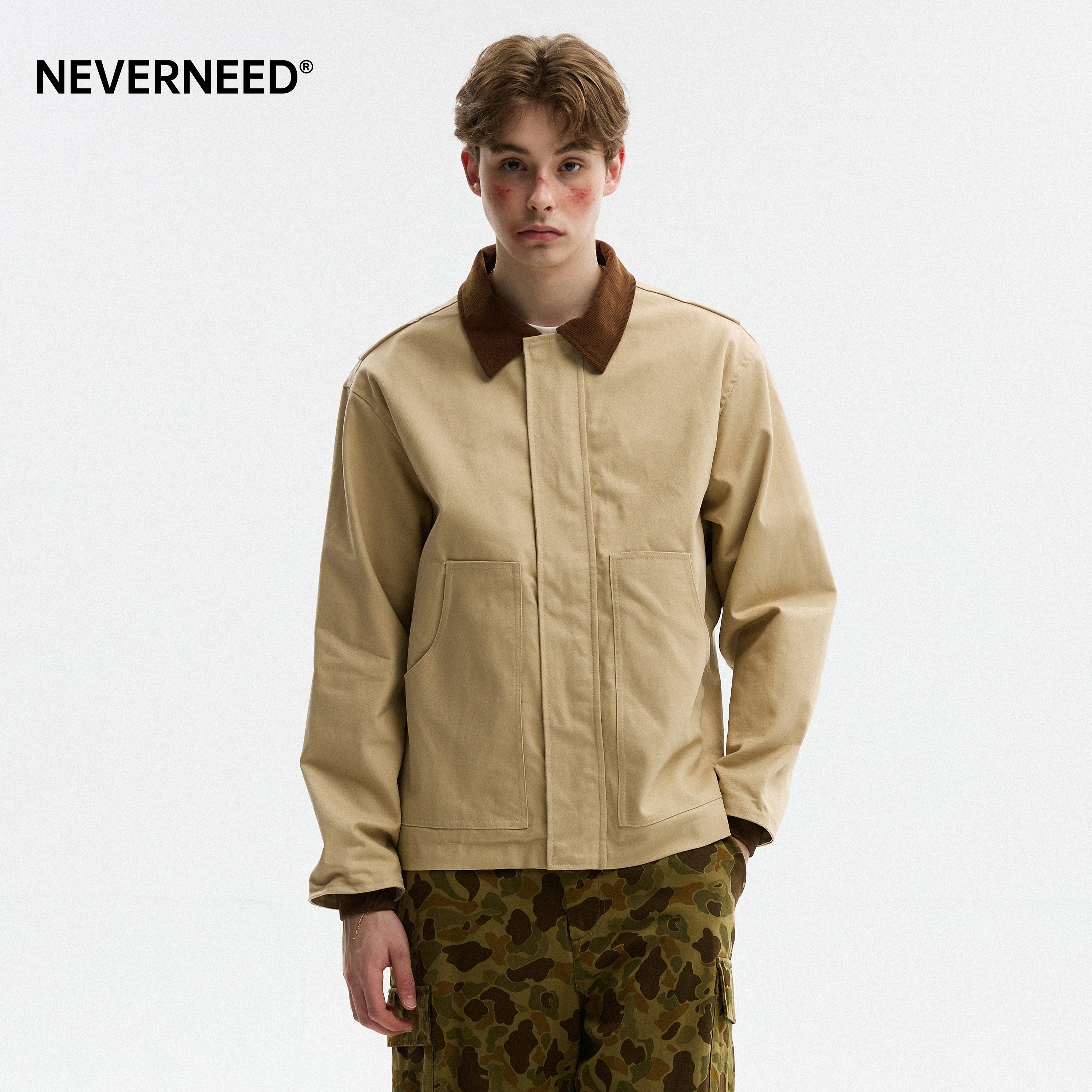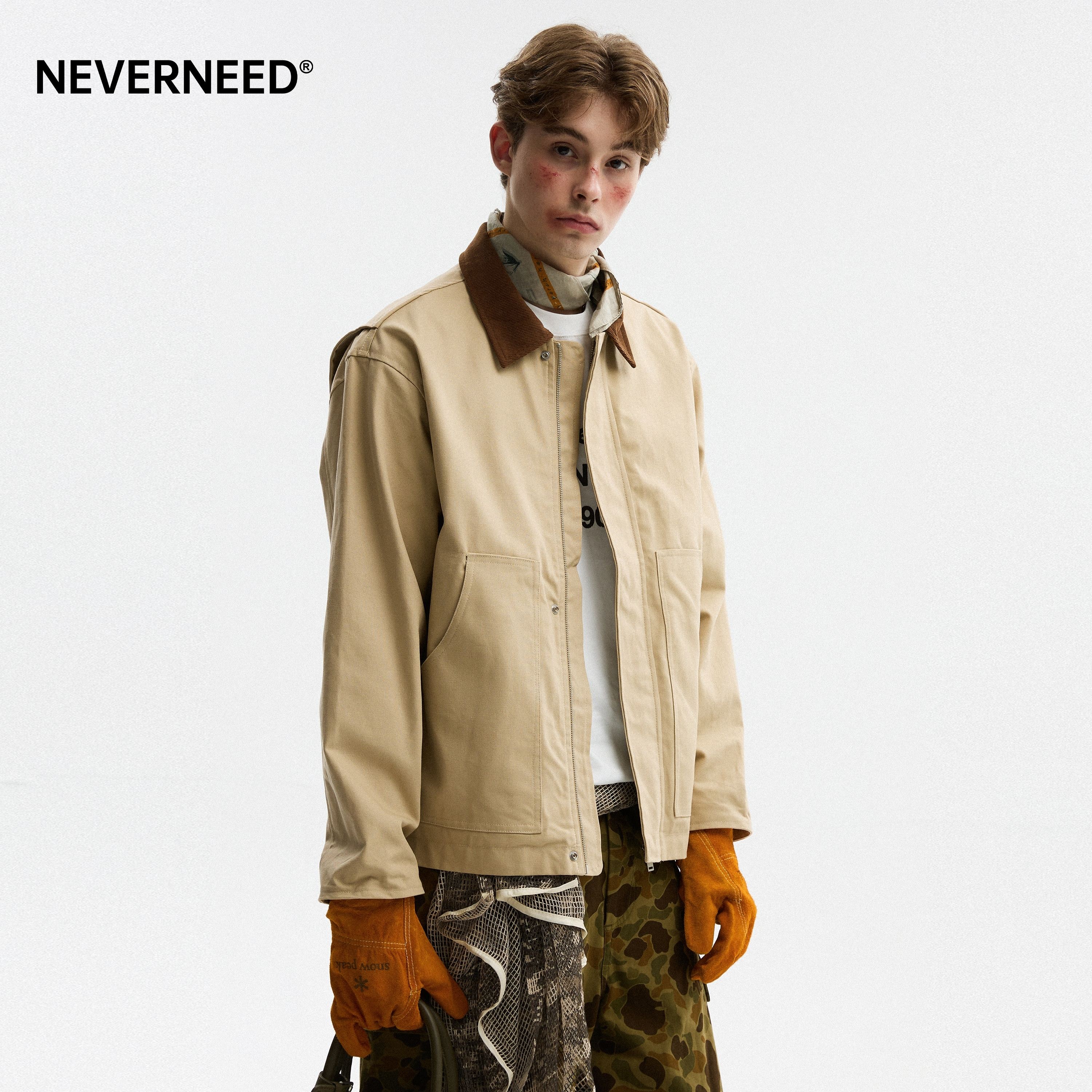 NEVERNEED底特律翻领外套男秋季撞色帆布美式复古vintage工装夹克