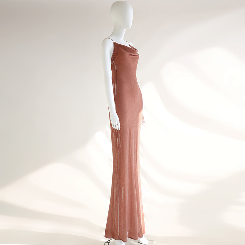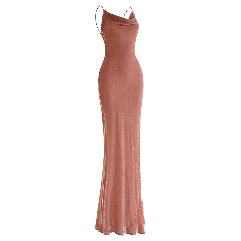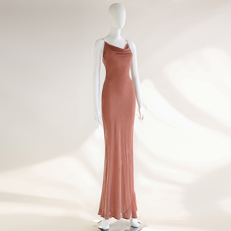 cicidream 复古粉色 真丝绒 吊带长款修身 连衣裙