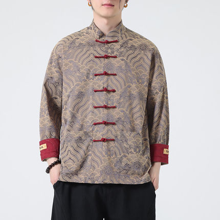 国潮高品质水波纹提花唐装衬衫中式圆领盘扣中山装长袖民族风特色