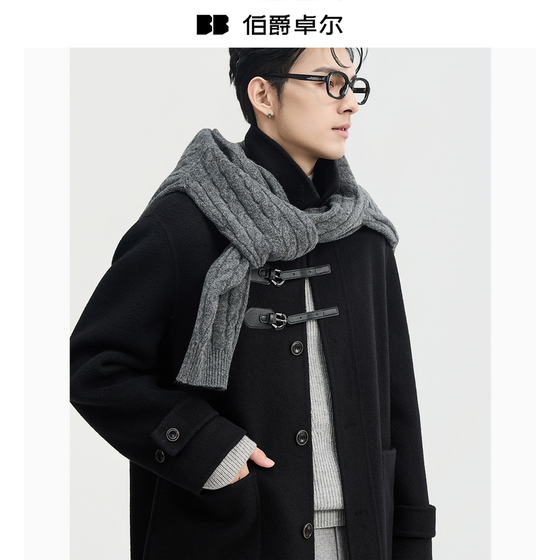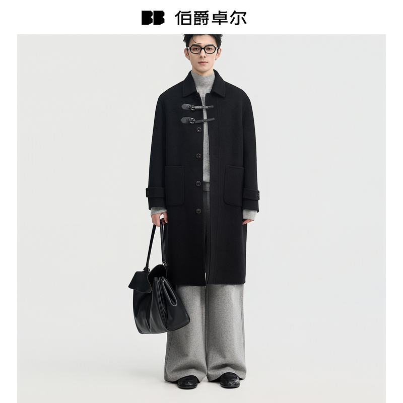 {骆驼绒高级设计感门襟}BJZE25冬季中长款双面羊毛呢大衣男士外套