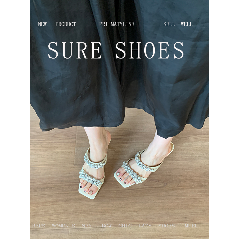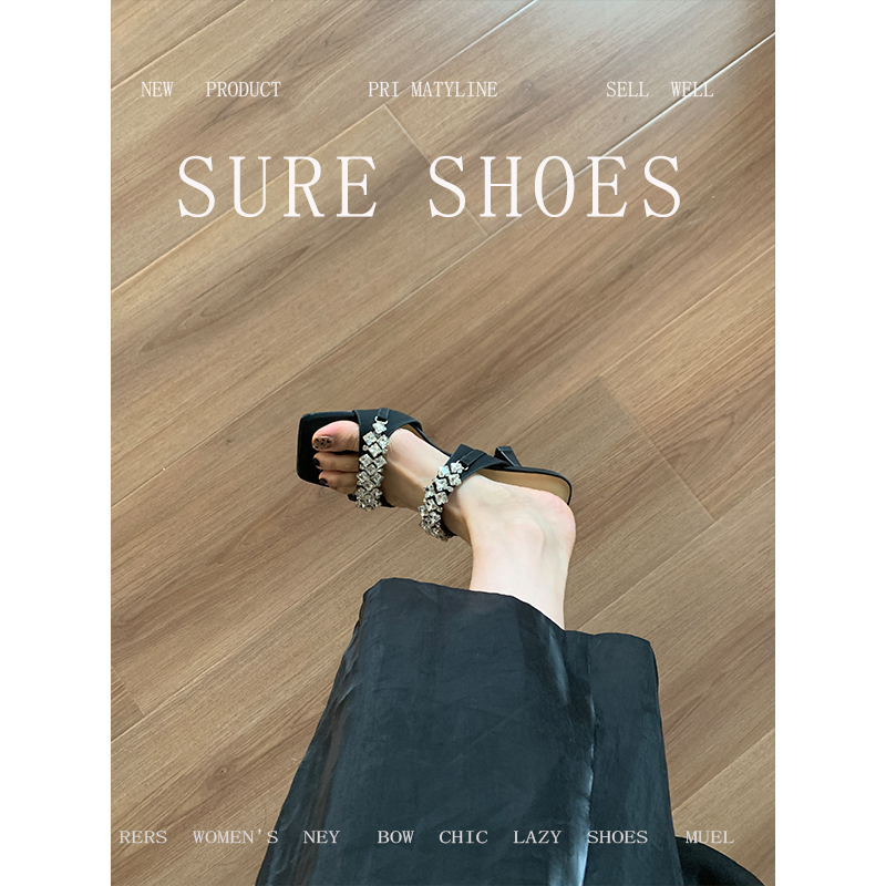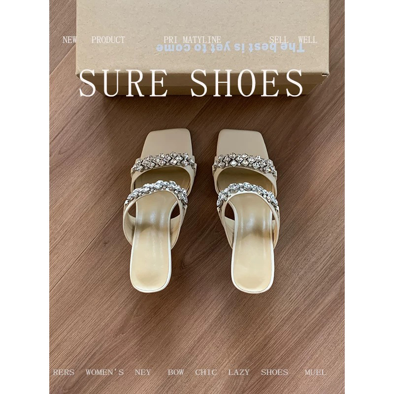 7cm法式水钻缎面凉拖外穿2025夏季新款方头高跟一字拖鞋