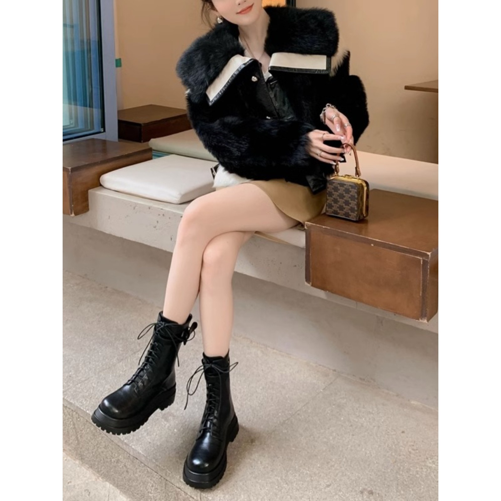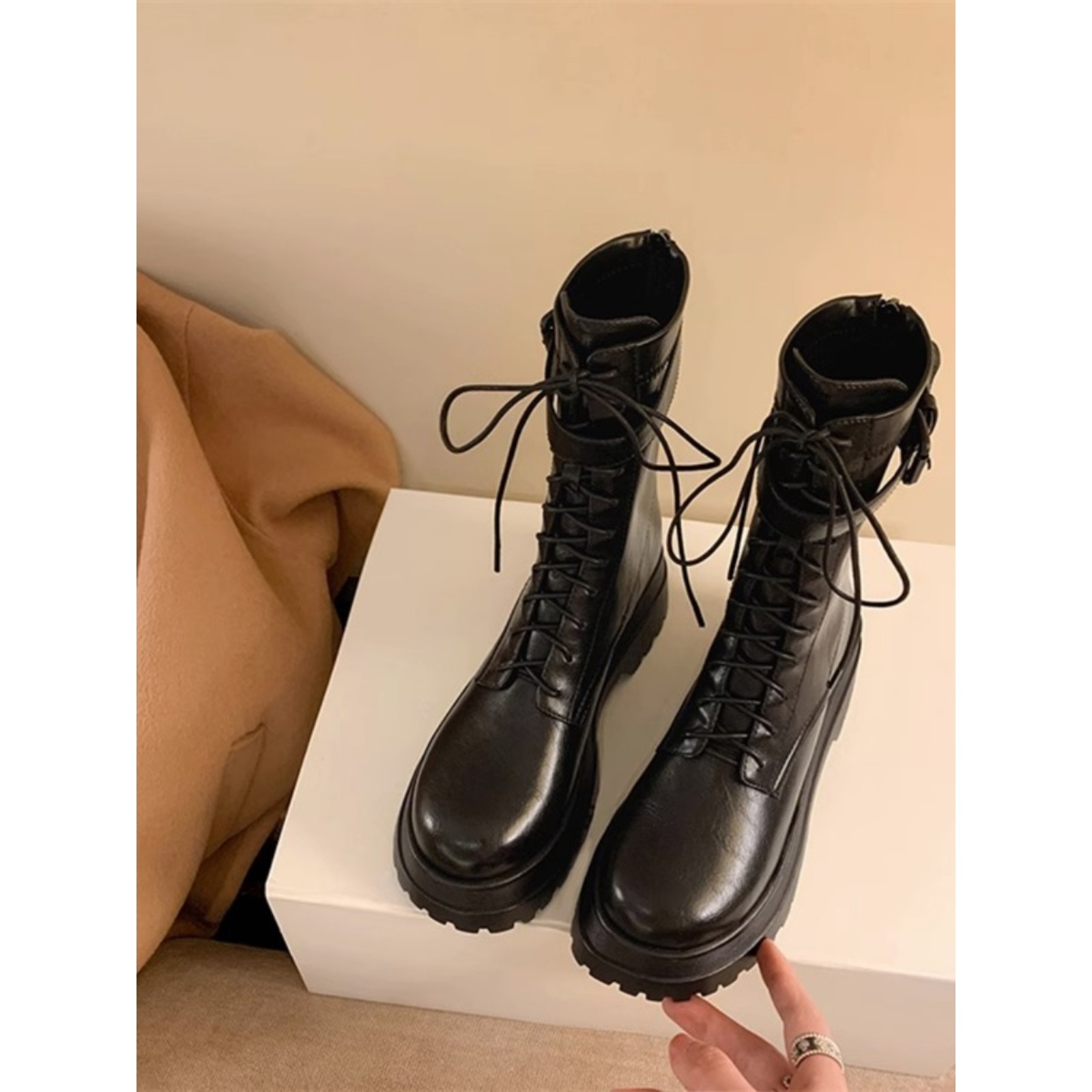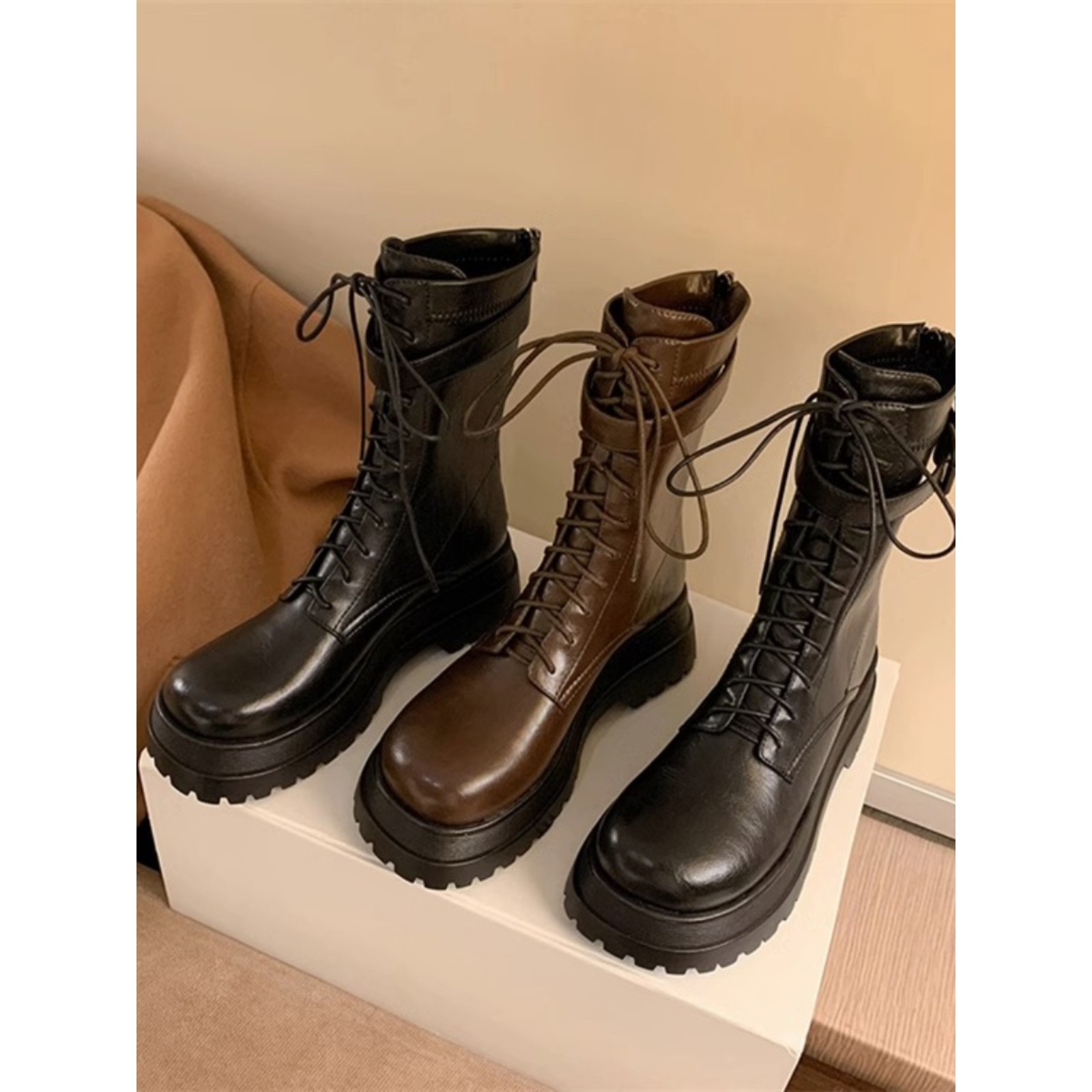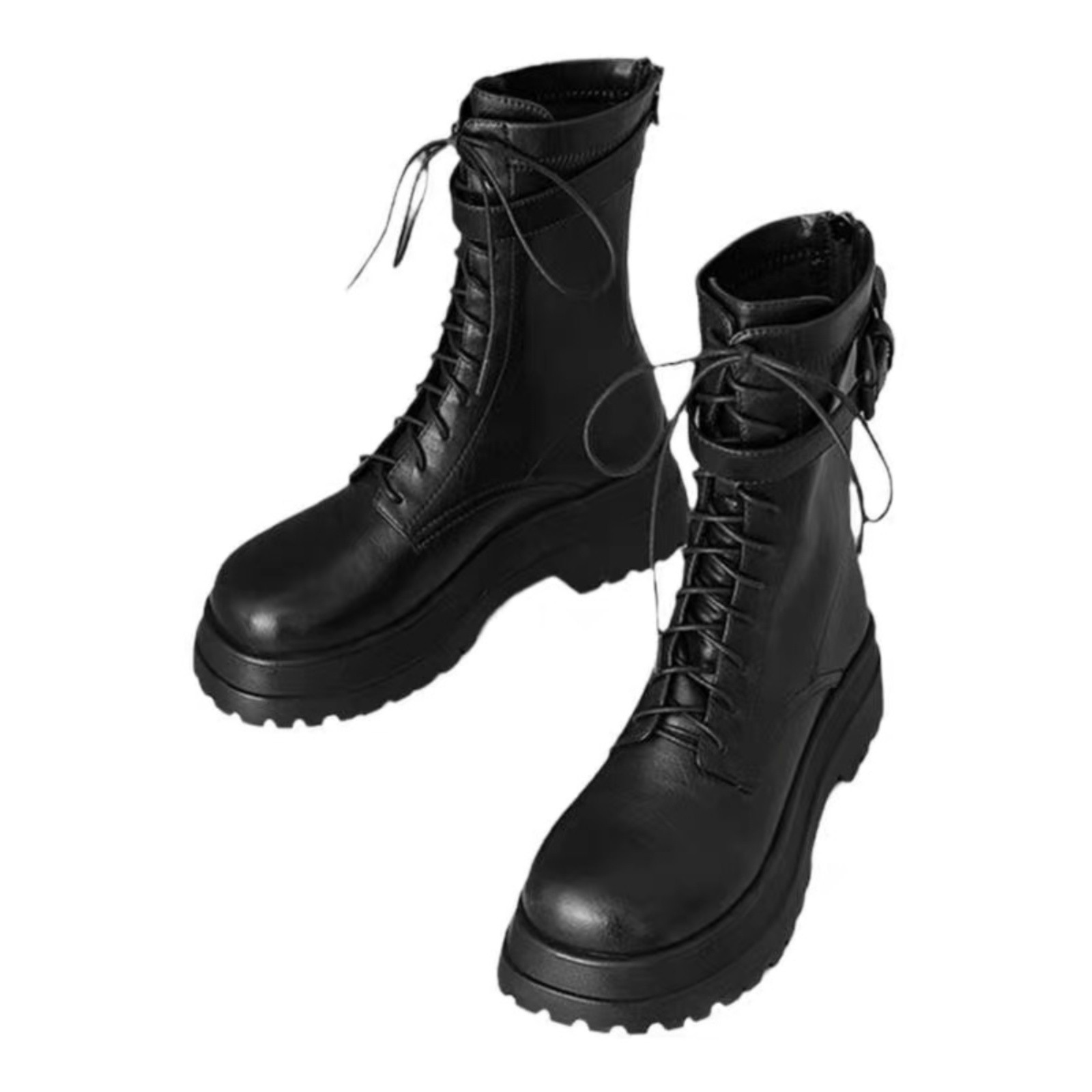 真皮厚底增高马丁靴女2025秋冬新款英伦风系带中筒靴骑士靴短靴子