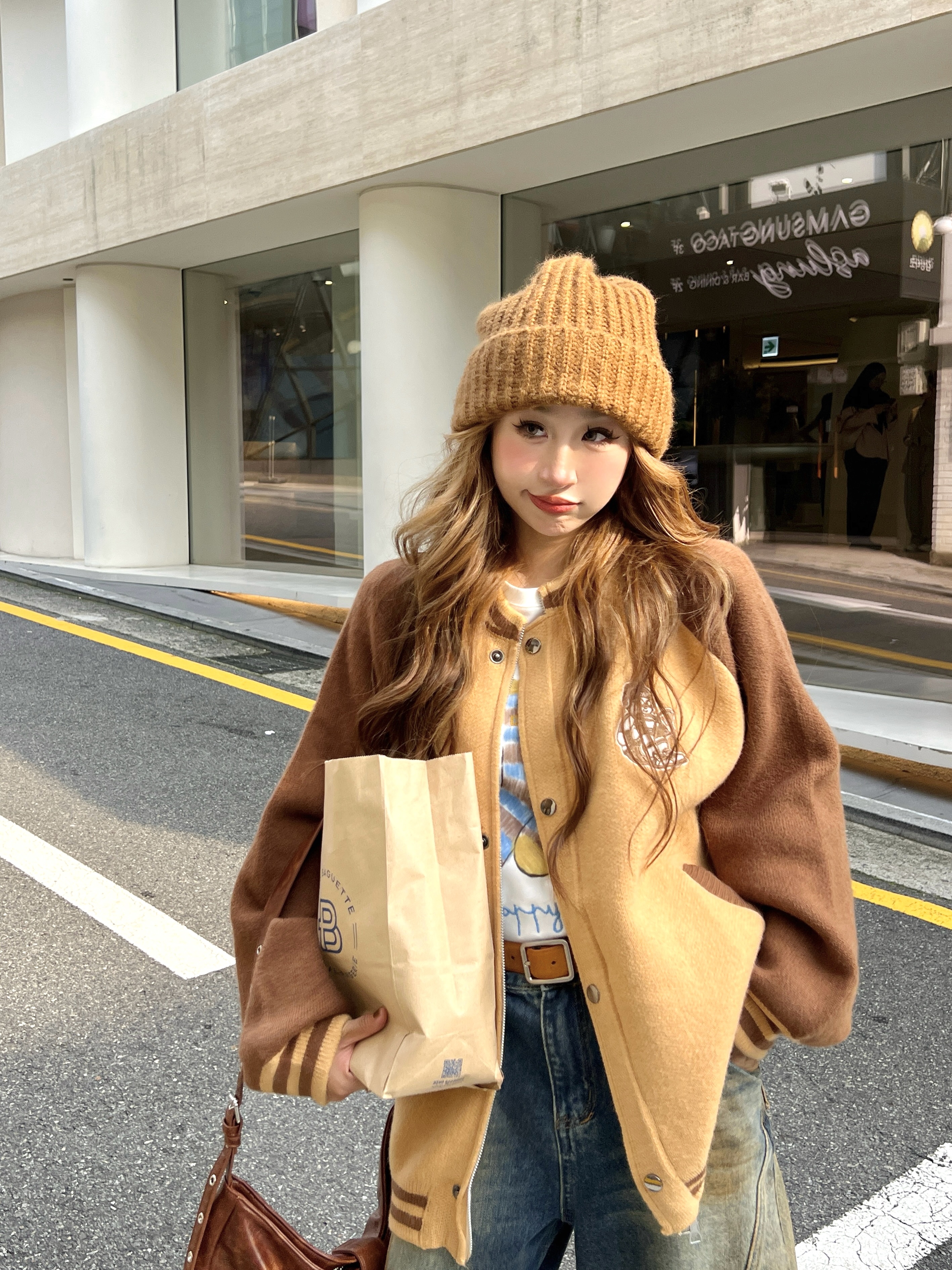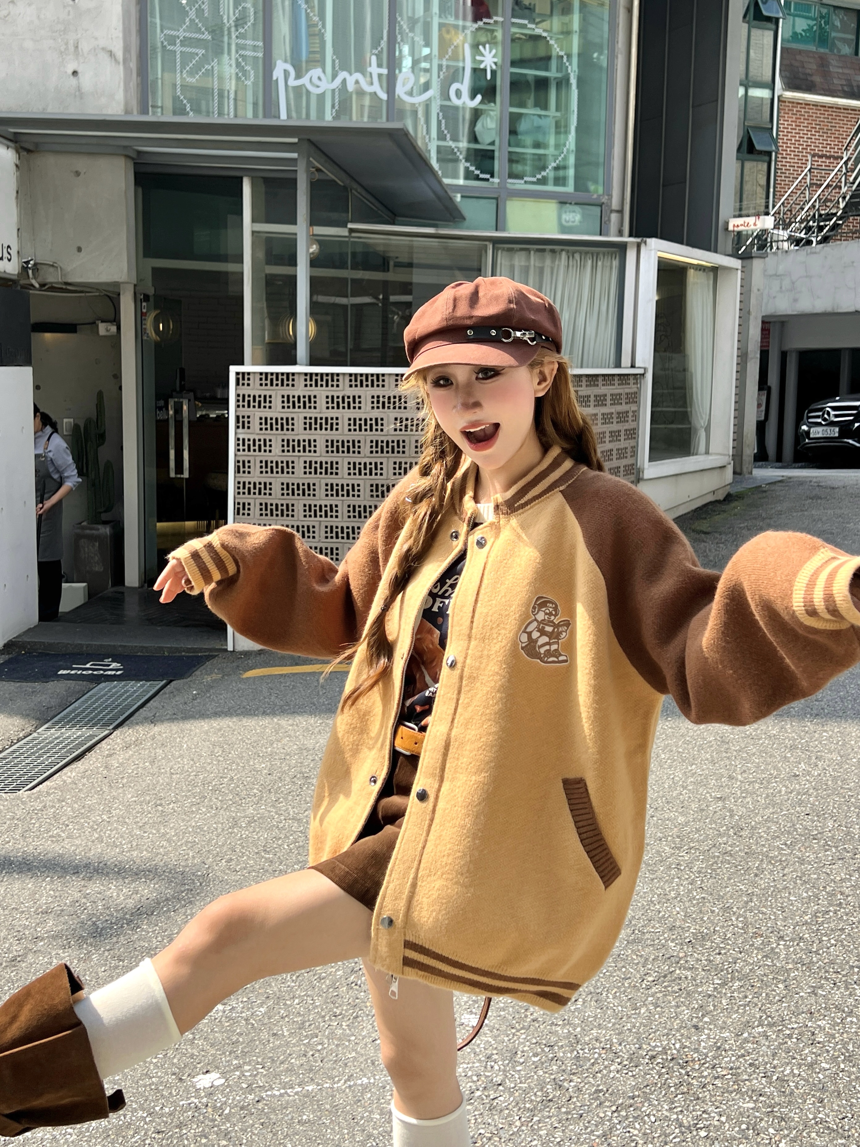 林诗琦NICKIDAILY【栗棕球场!复古撞色字母刺绣棒球服针织外套女