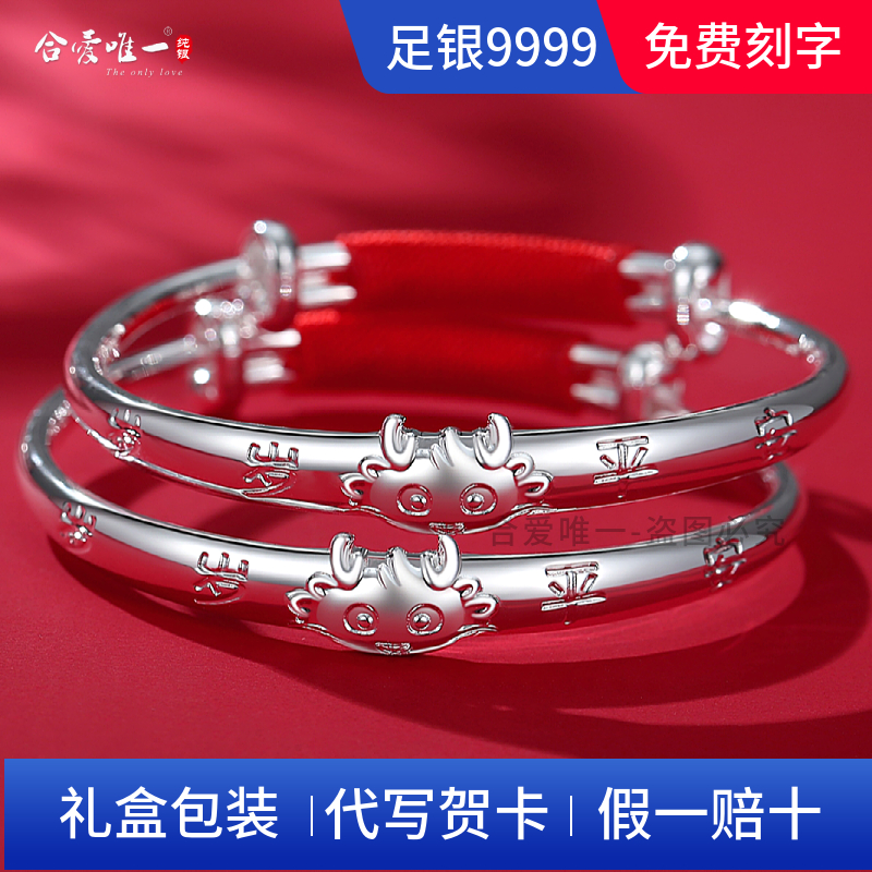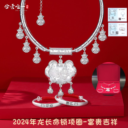 S999纯银金龙长命锁项圈足银吊坠男女小宝宝婴儿手镯满月周岁送礼