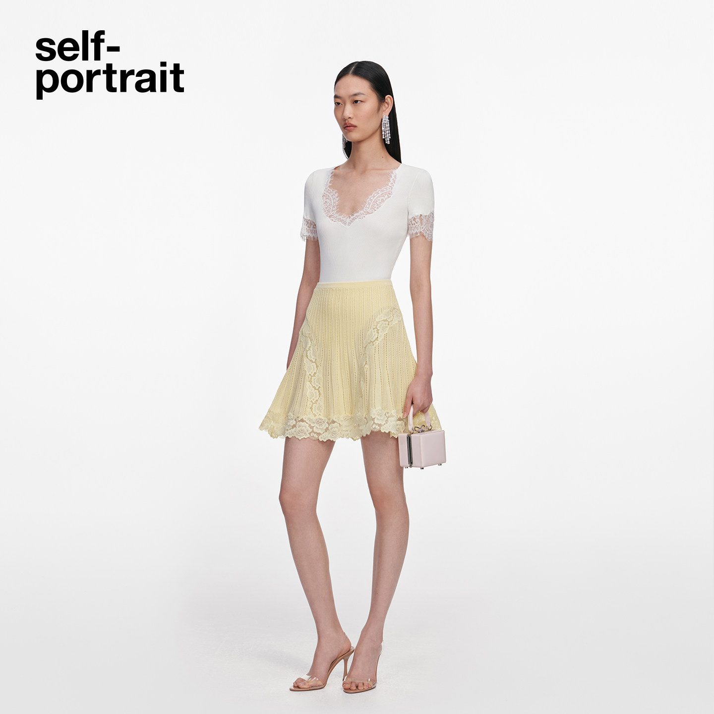 self-portrait 2026春夏新款奶油黄针织蕾丝拼接A字伞裙半身短裙