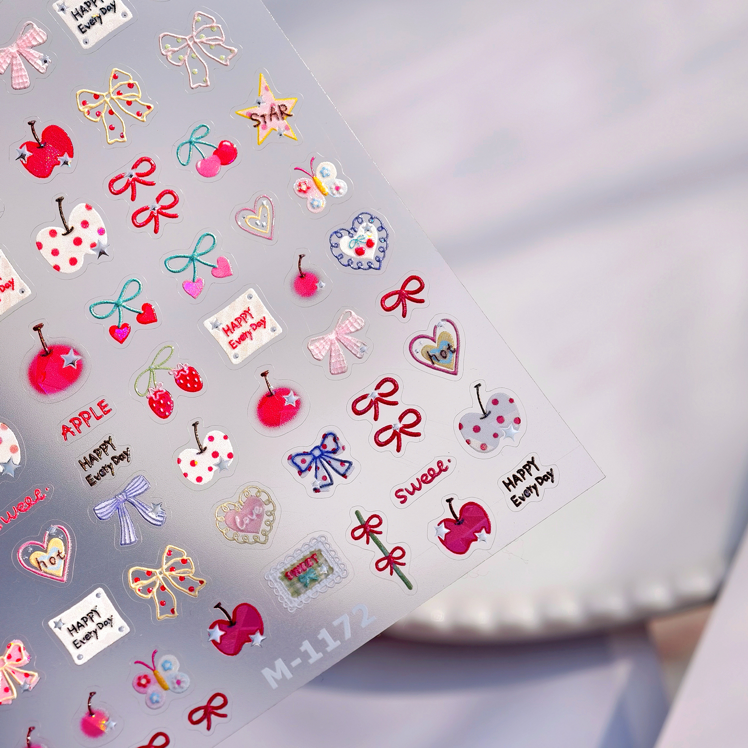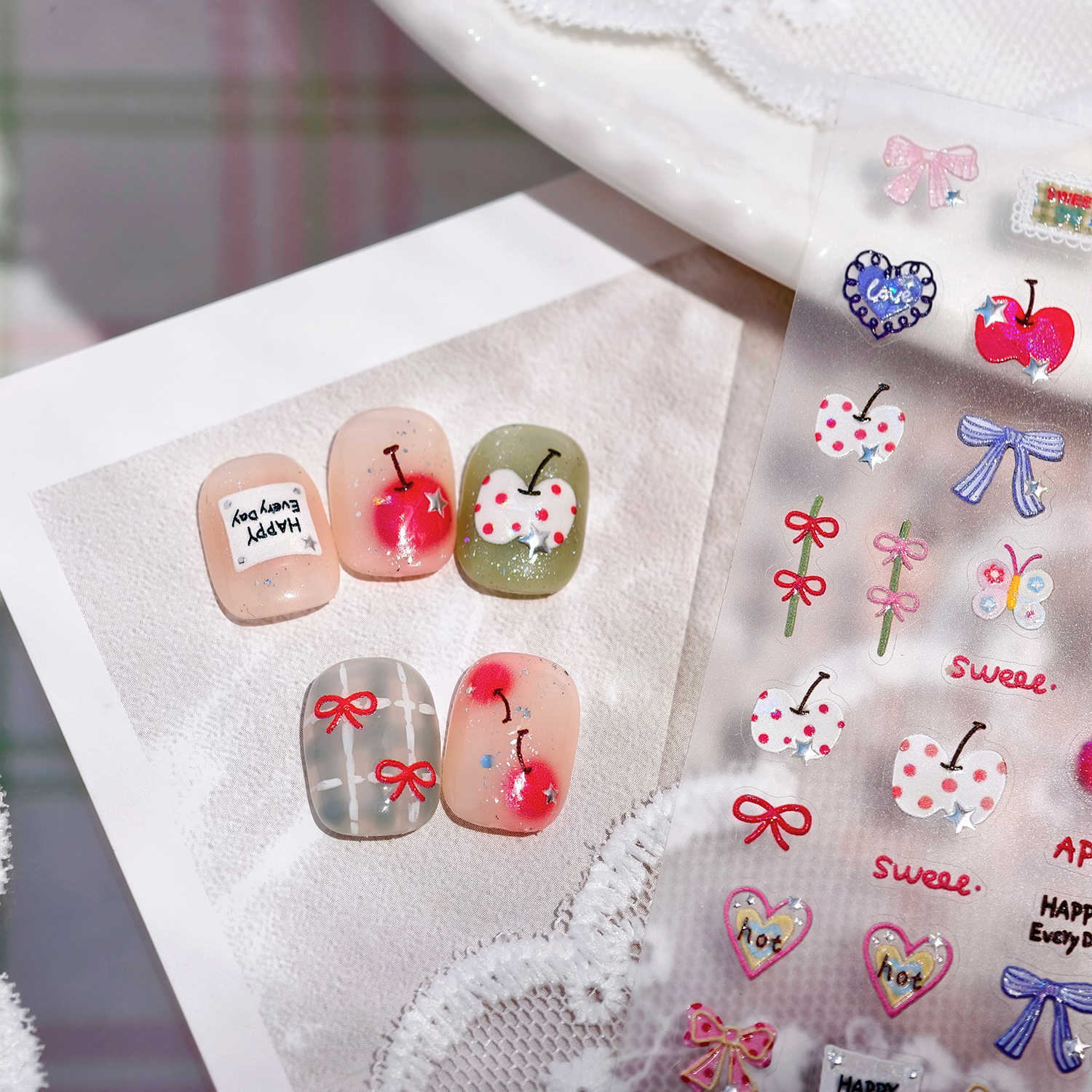 茉季手绘小苹果爱心蝴蝶结贝壳光美甲贴纸防水指甲贴装饰品M1172