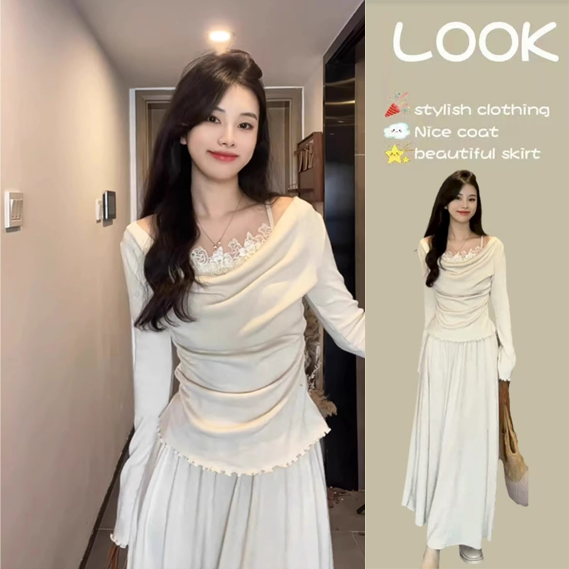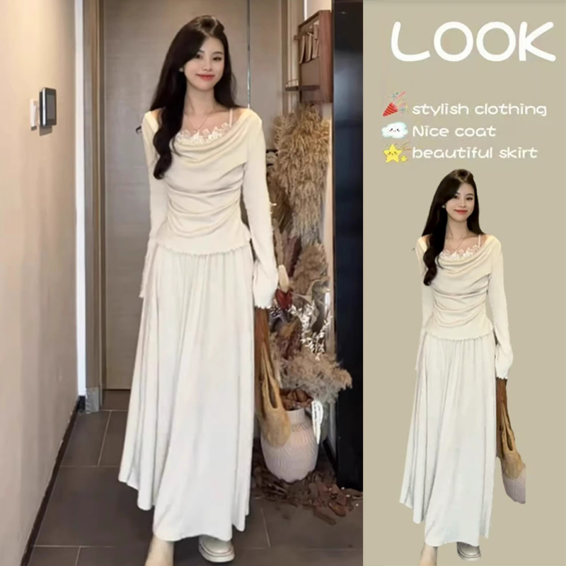 高级感露肩纯欲长袖一整套穿搭打底连衣裙女秋冬韩系配大衣两件套