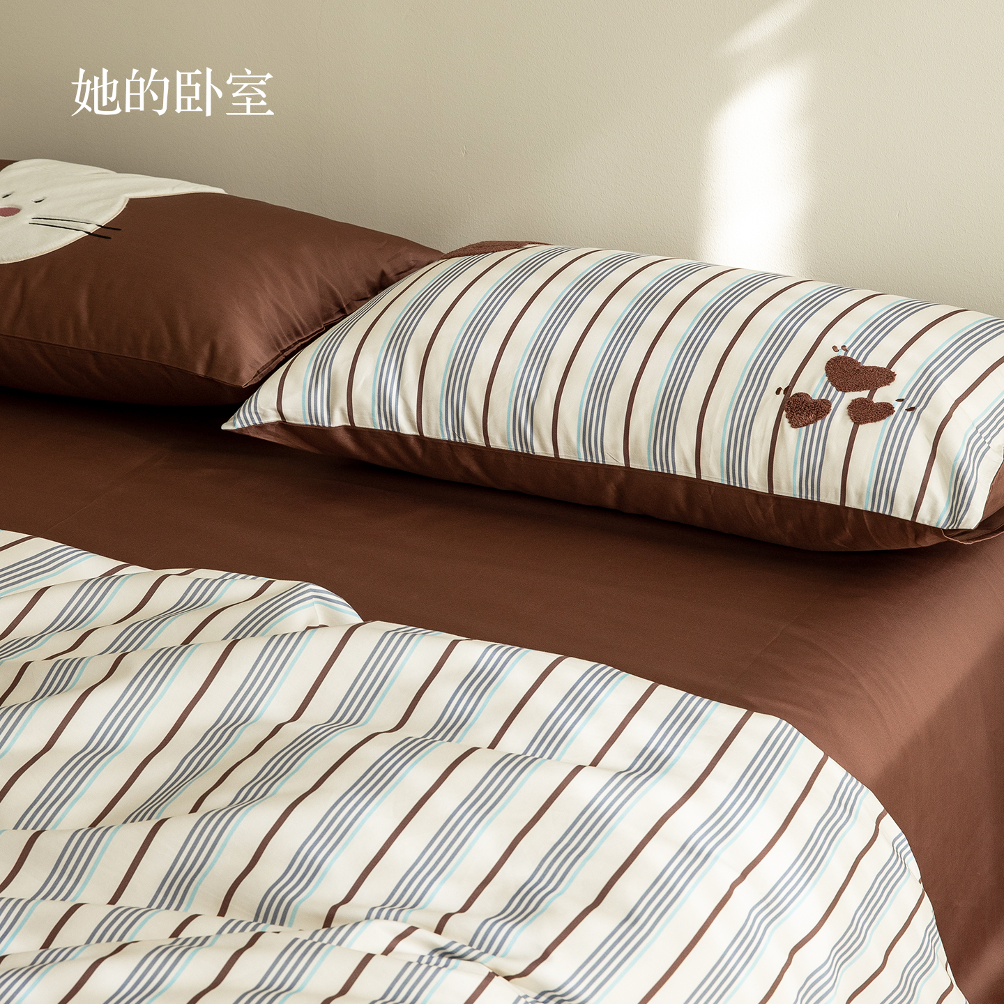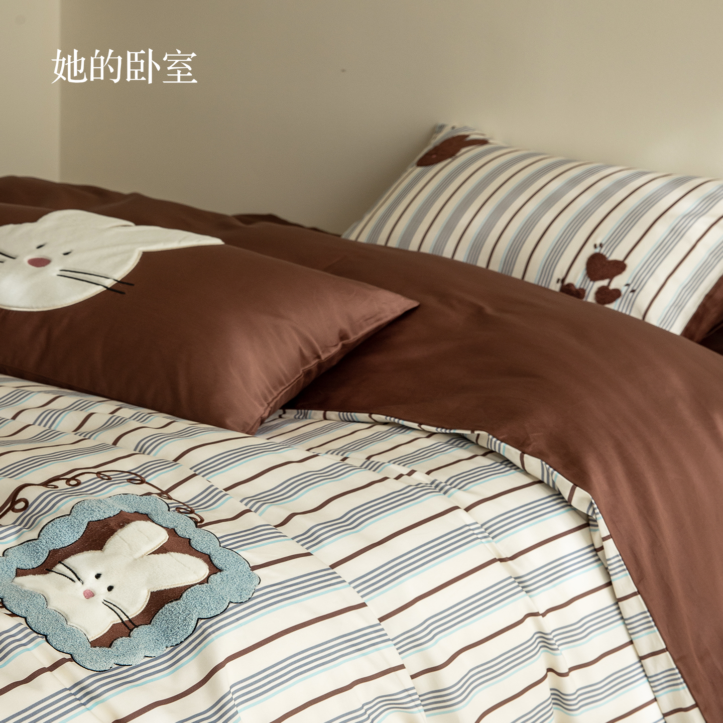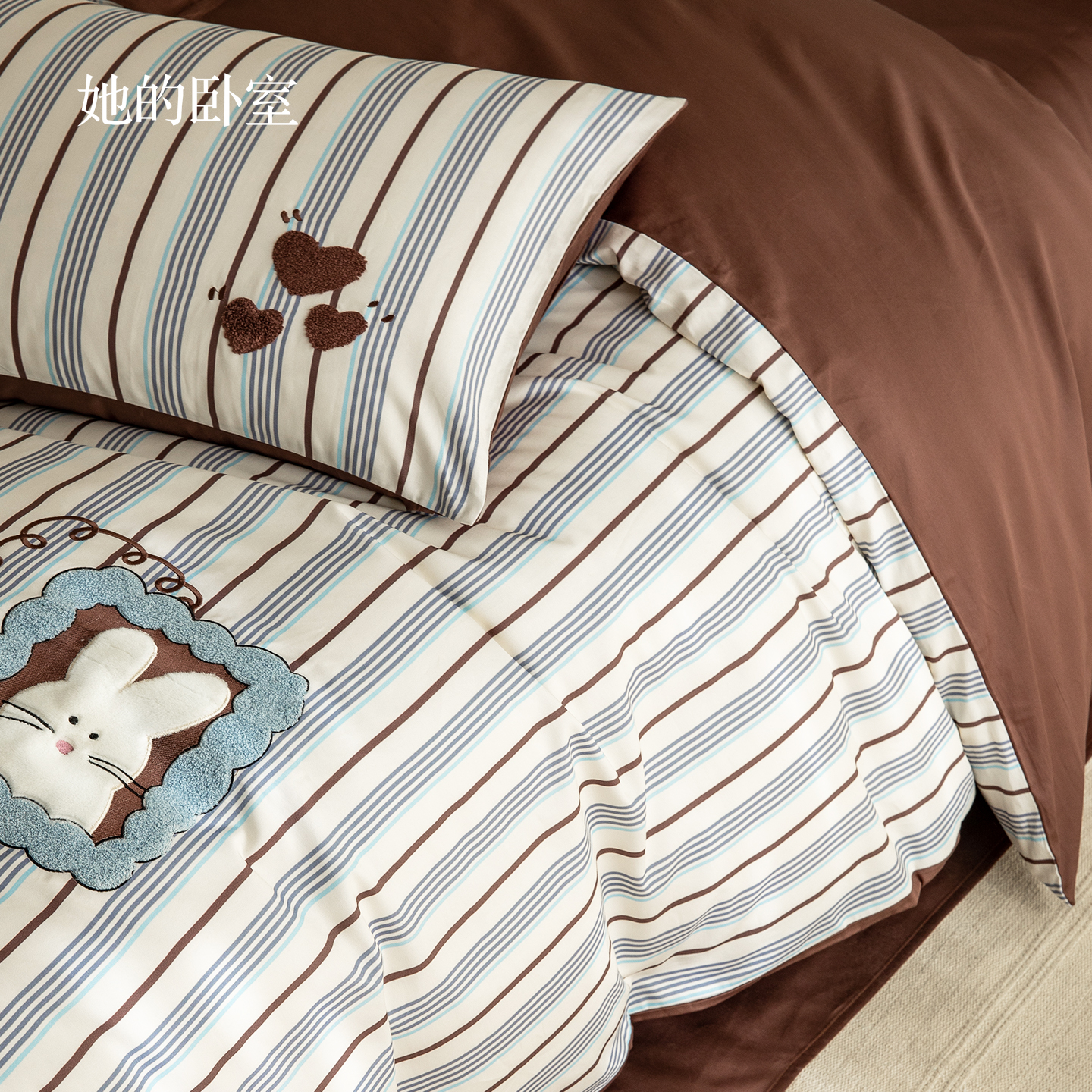 她的卧室高级感条纹爱丽兔卡通长绒棉四件套贡缎全棉纯棉床单被套