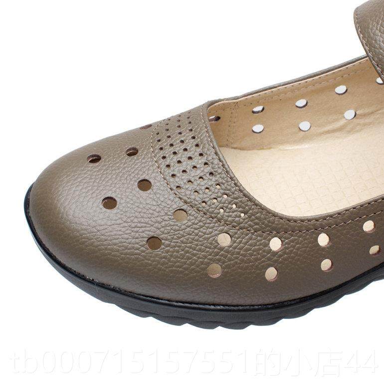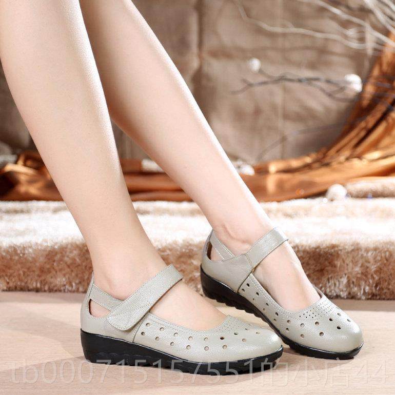 正品春季真皮洞鞋平洞跟底小魔术贴中老年妈妈鞋圆头女凉鞋平码33