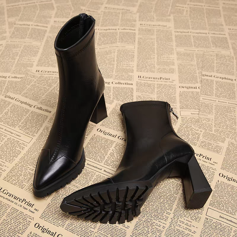 尖头短靴女今年流行新款粗跟高跟小个子法式瘦瘦靴弹力马丁靴