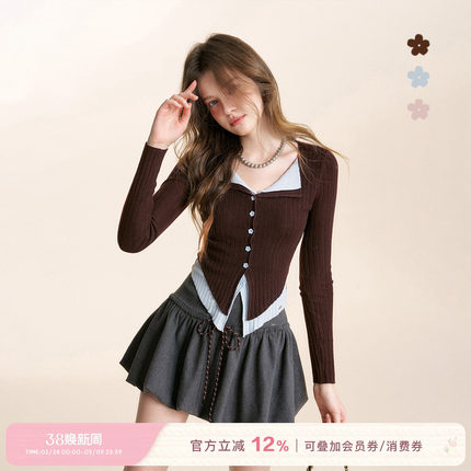 张籽沐同款Kroche 浪漫法式 羊毛混纺假两件撞色翻领针织打底开衫
