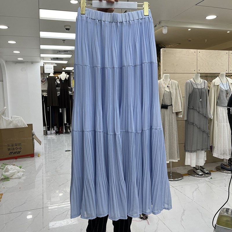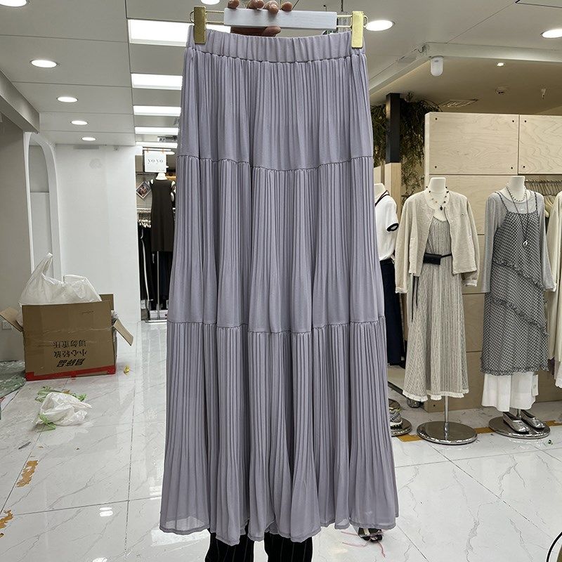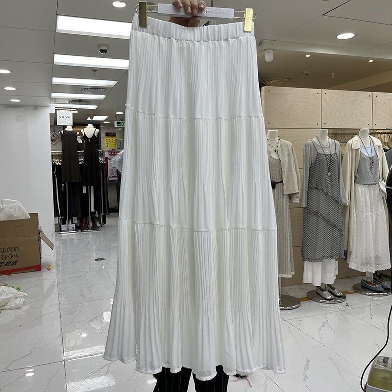 韩系纯色压褶大摆雪纺半身裙女2025春夏新款高腰显瘦百褶a字长裙