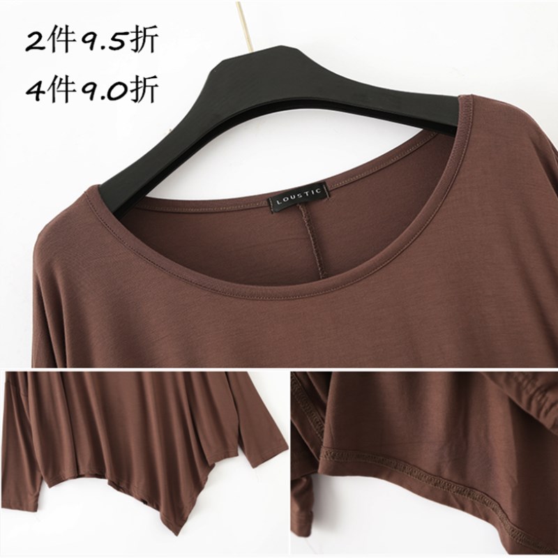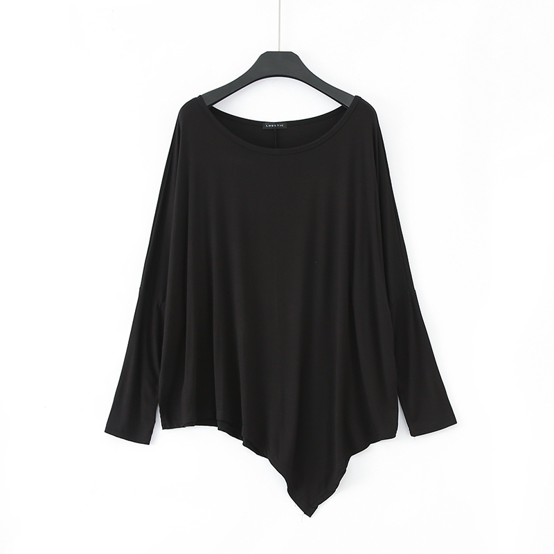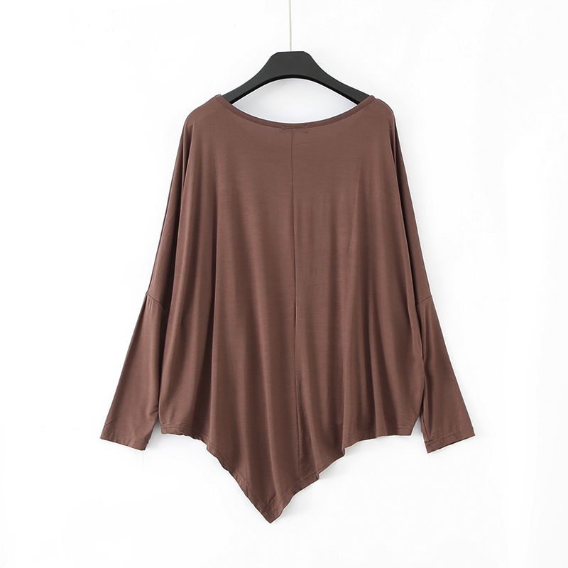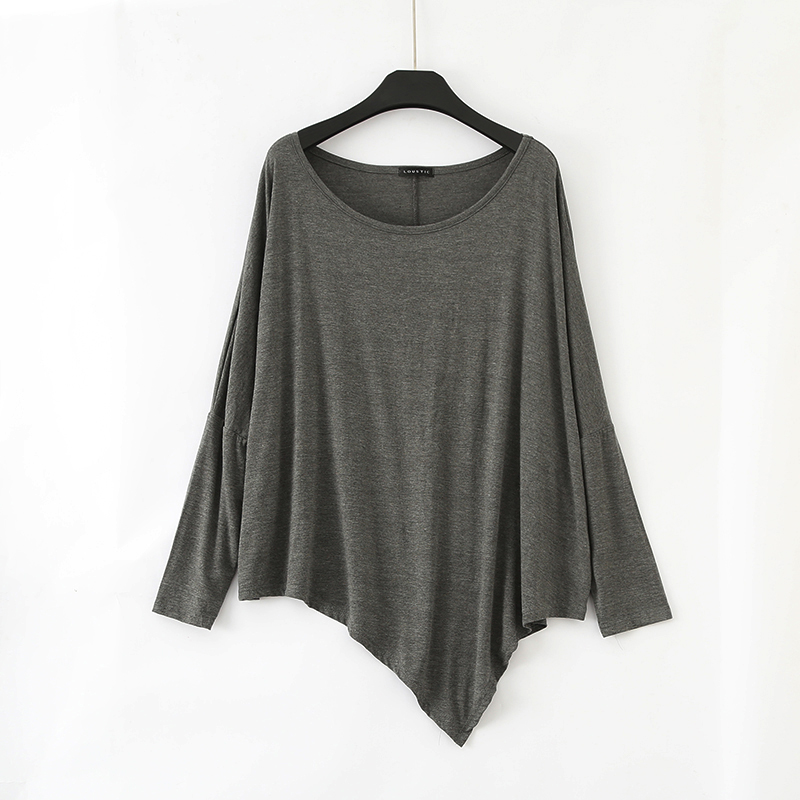 莫代尔大码长袖t恤圆领宽松中长款打底衫女春秋不规则蝙蝠袖上衣