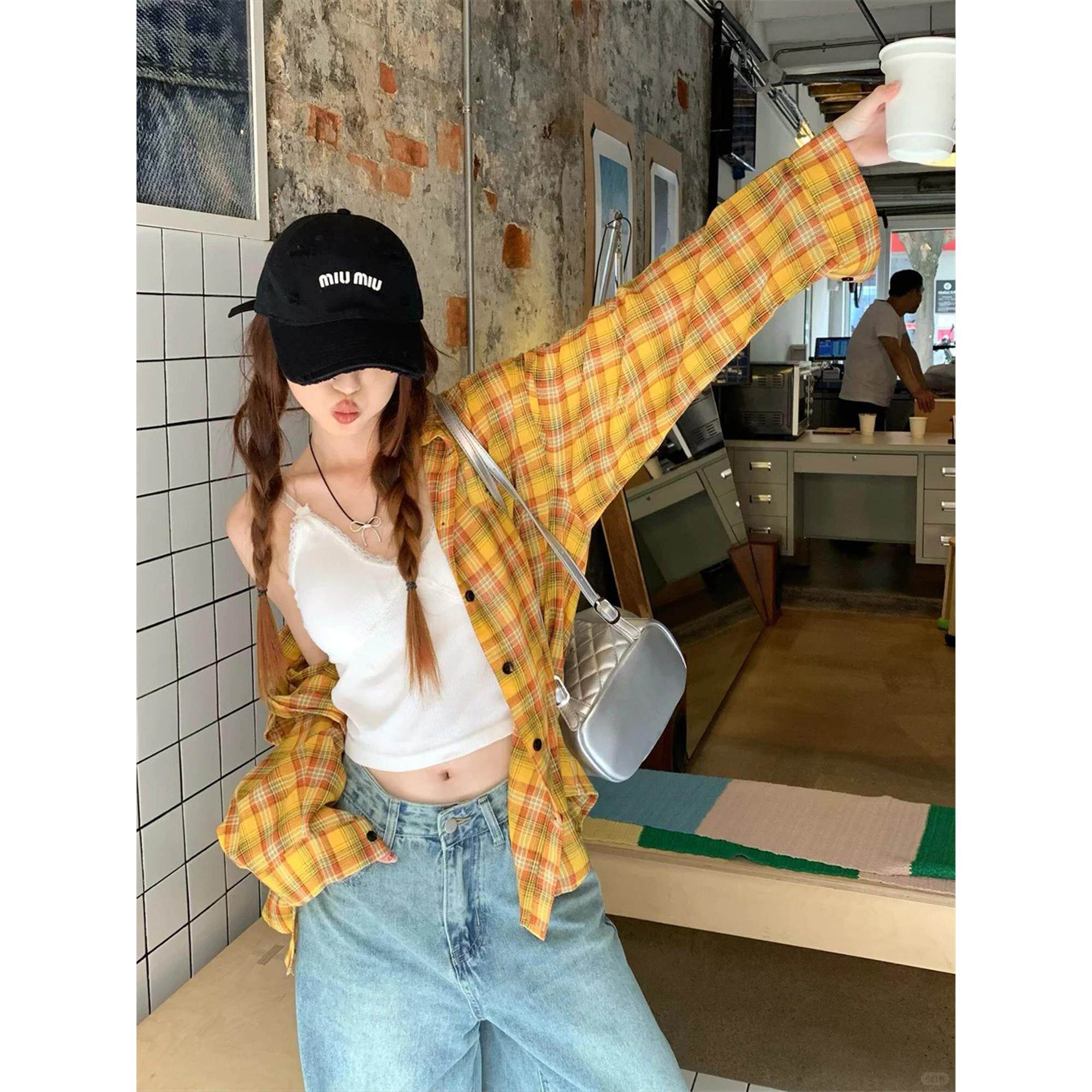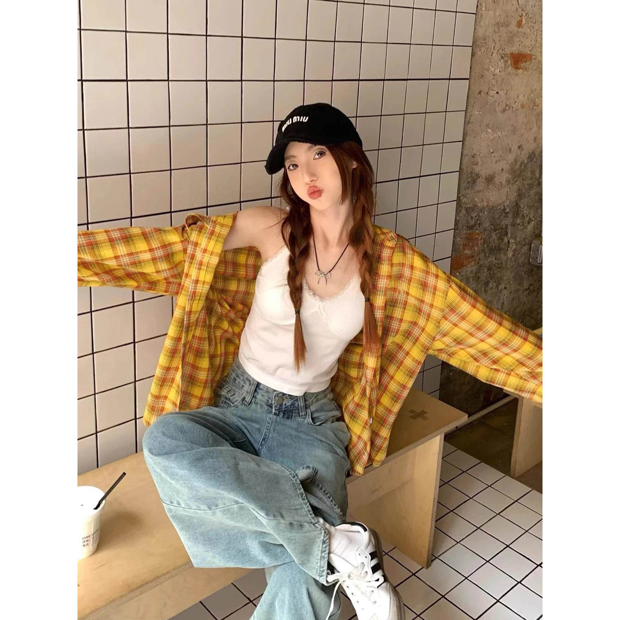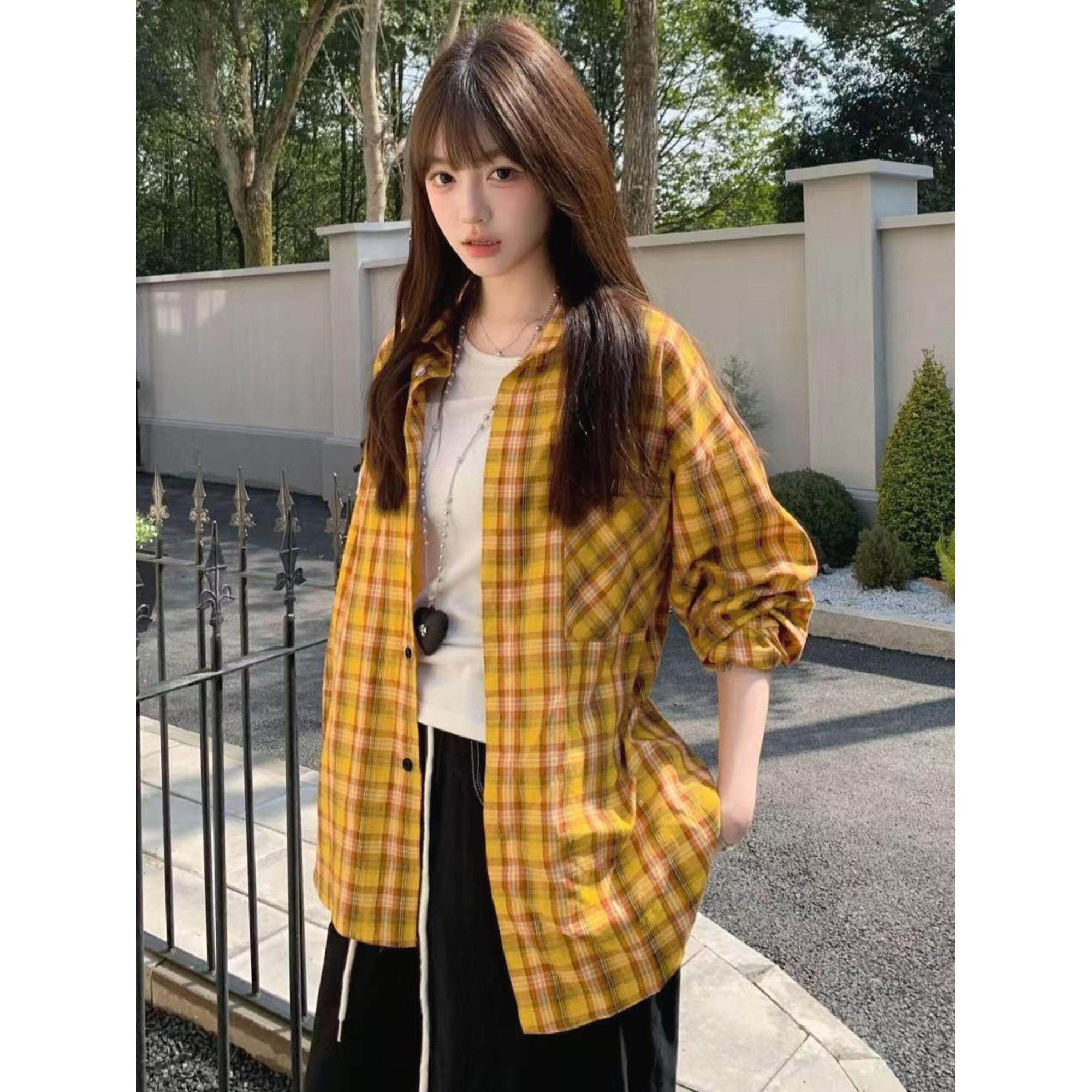 黄色格子衬衫女春独特漂亮新款小衫内搭叠穿衬衣防晒长袖上衣外套