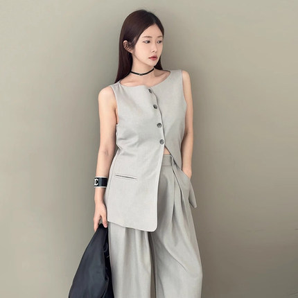良良家法式气质西装马甲背心女夏季新款高腰小众百搭压褶休闲长裤