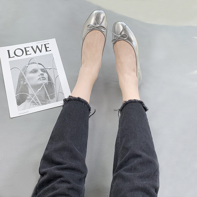 新款金色银色方头浅口真皮百搭蝴蝶结芭蕾舞平底女单鞋奶奶鞋春季