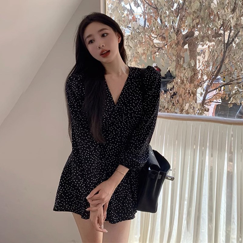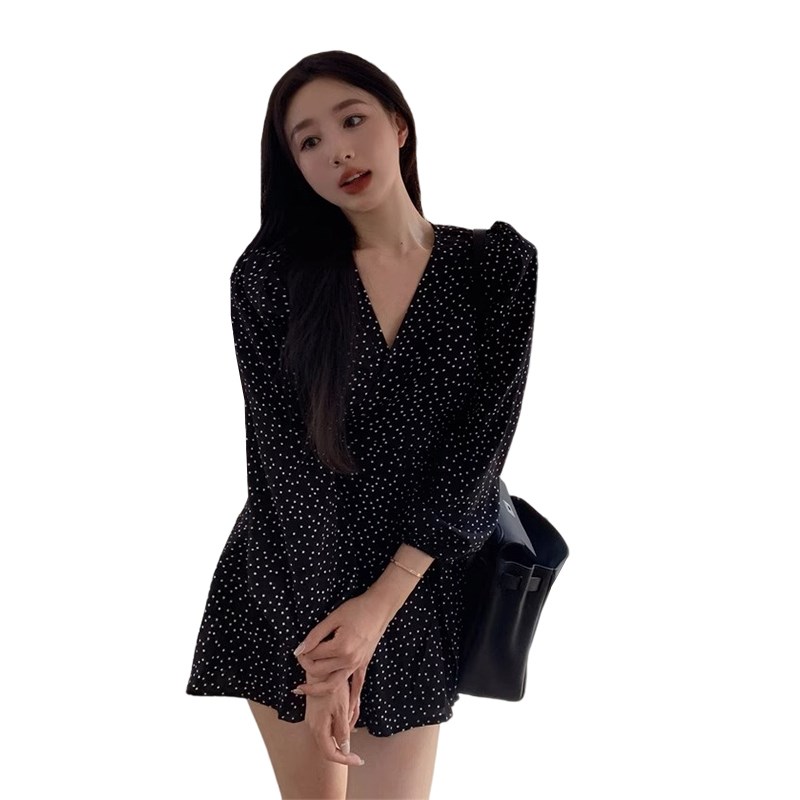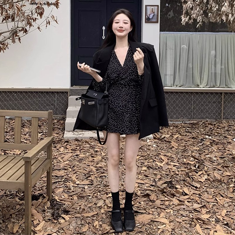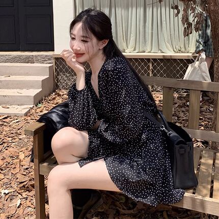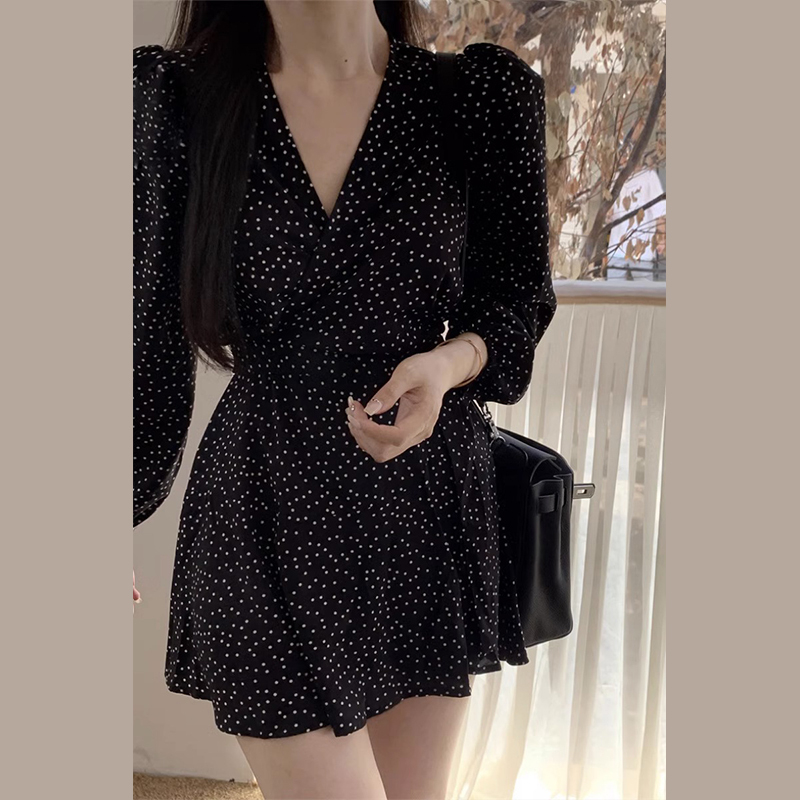 赫本风黑色波点长袖连衣裙子女春秋2024新款茶歇法式收腰显瘦短裙