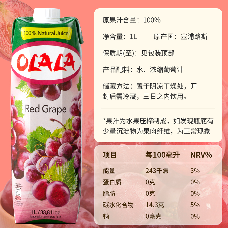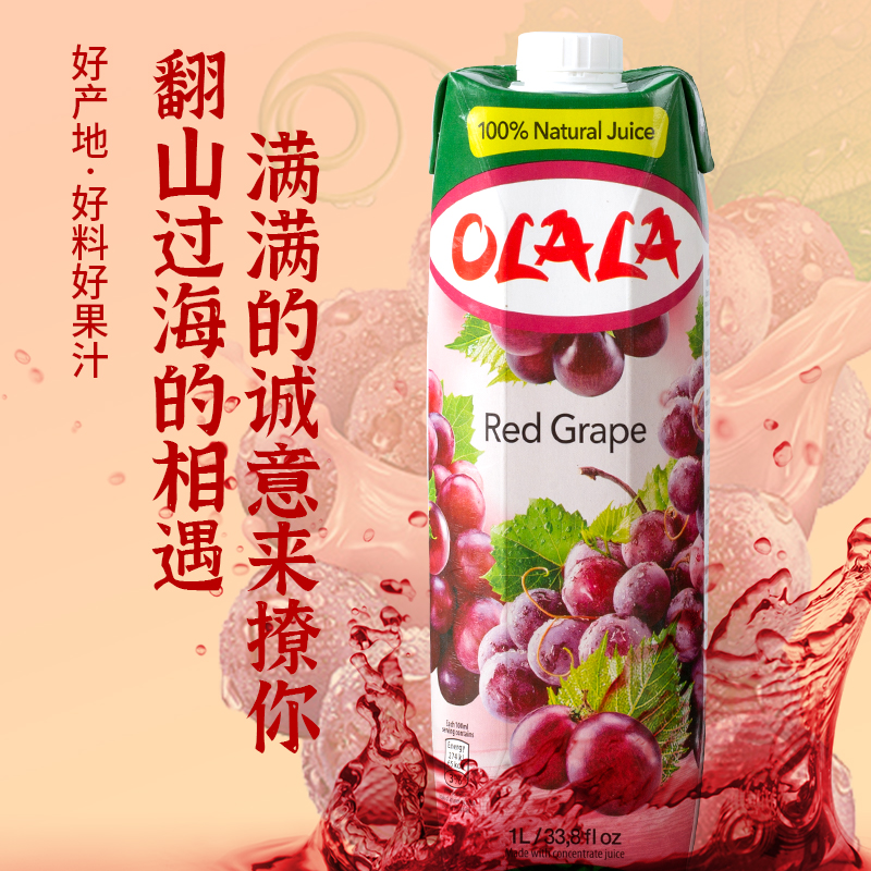 塞浦路斯进口欧啦啦百分百果汁OLALA葡萄汁1L*4轻食果蔬汁饮料
