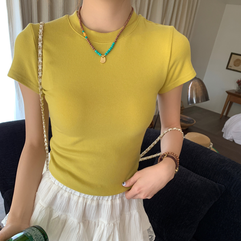黄色圆领短袖T恤女装2025新款高级感体恤夏季莫代尔正肩修身上衣