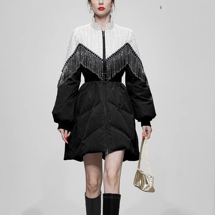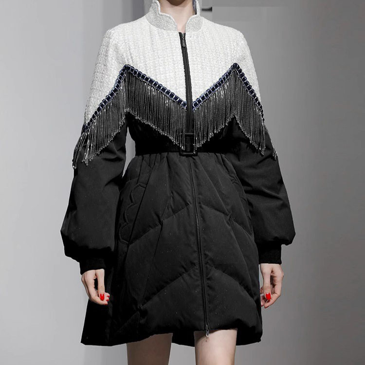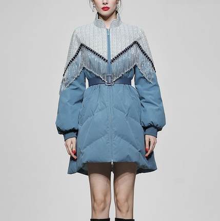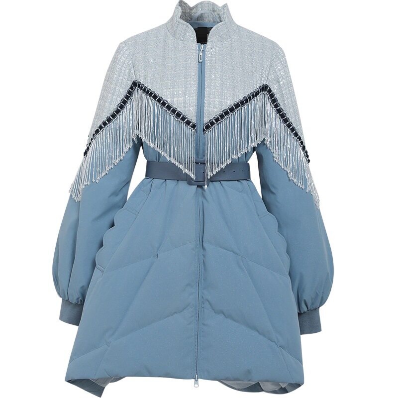 冬季女装新款撞色收腰中长款白鸭绒羽绒服蓝色加厚面包服外套