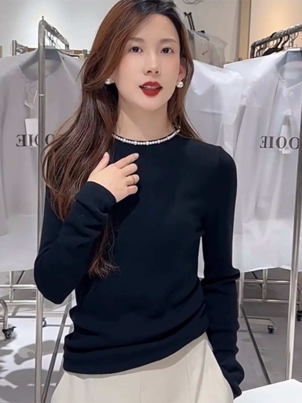 24简约贴身毛衣钉珠圆领长袖T恤女羊毛衫修身显瘦打底针织绒毛衫