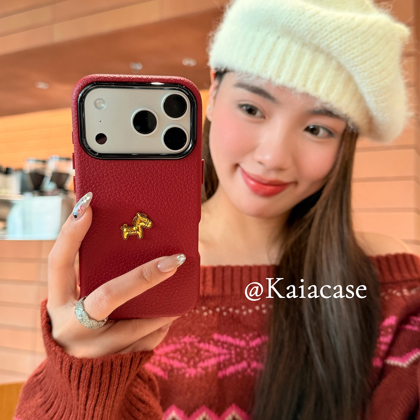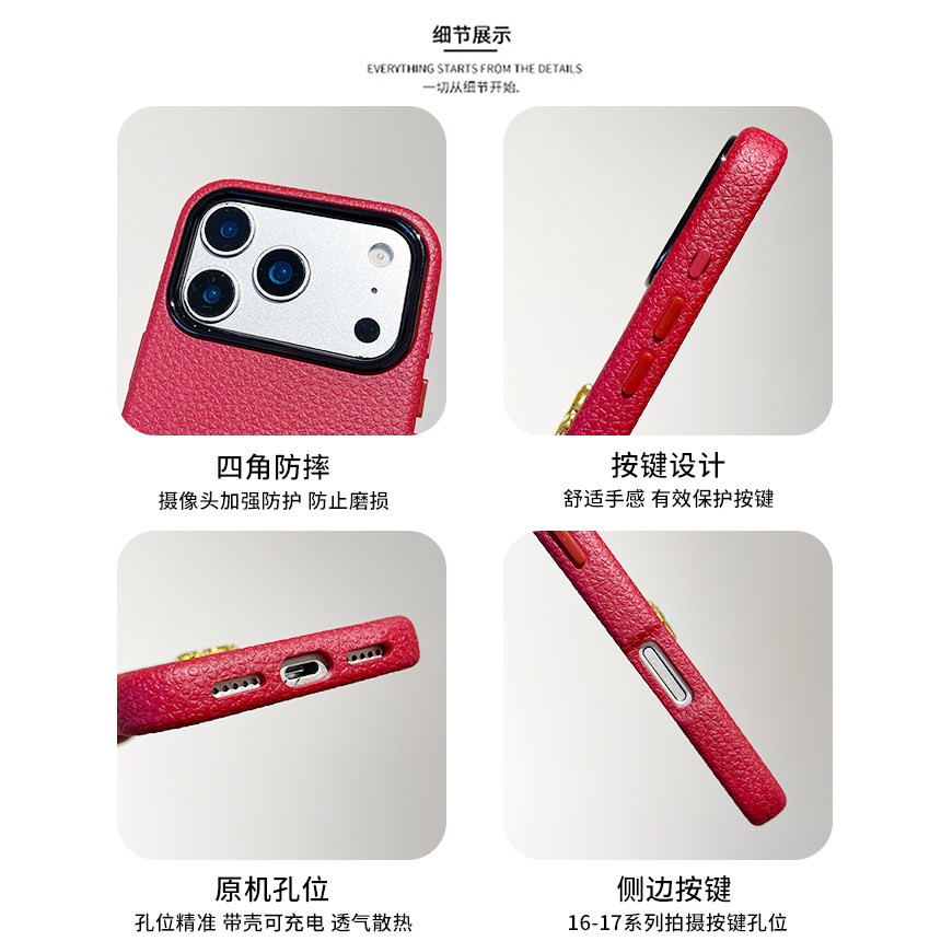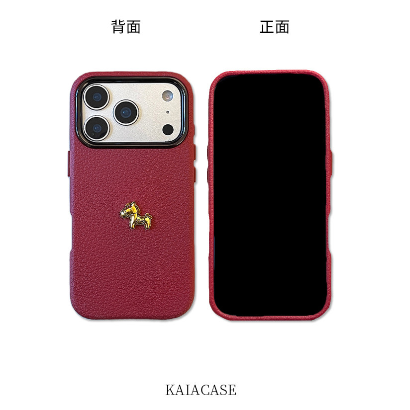 kaia 秋冬皮纹简约酒红色立体金马适用苹果17promax手机壳iphone16pro新款13女14pro创意15pro全包防摔手机套