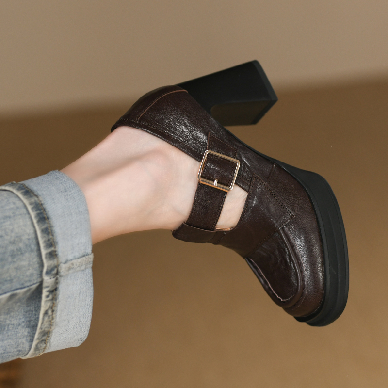 复古圆头深口高跟单鞋女春秋新款真皮羊皮皮带扣防水台粗跟小皮鞋