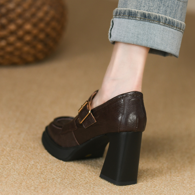 厚底真皮复古浅口高跟单鞋女