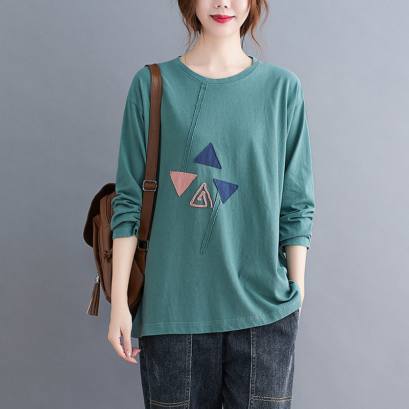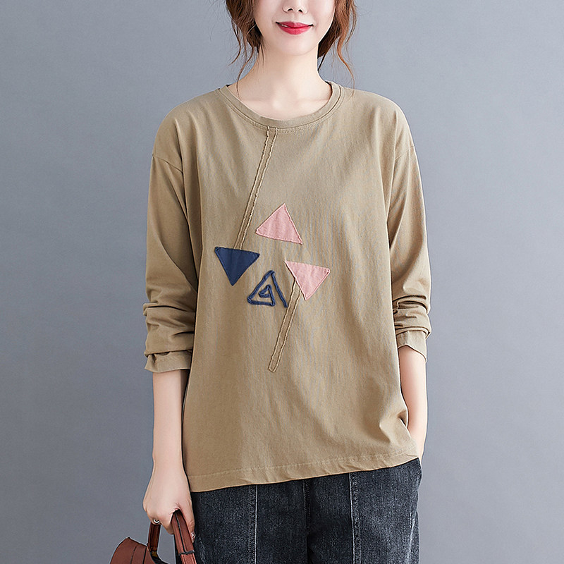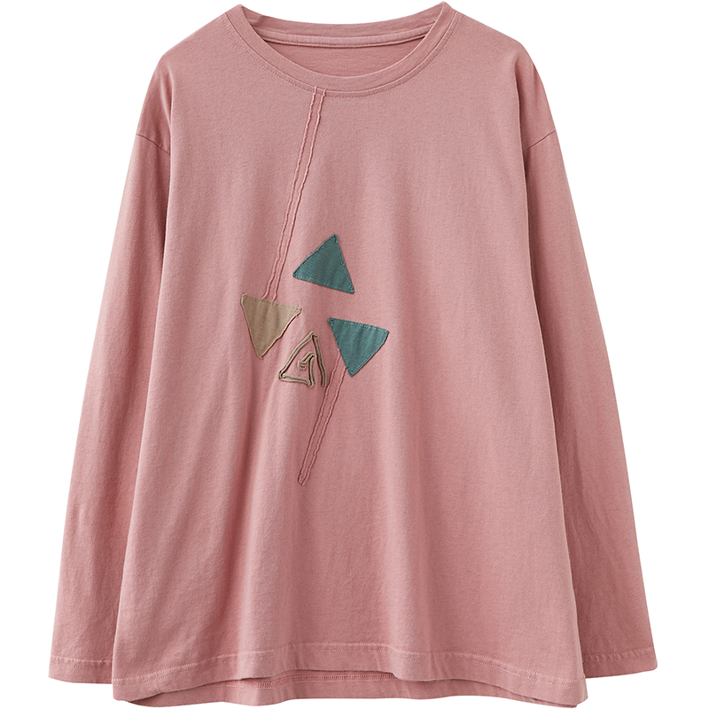 胖mm撞色贴布圆领长袖大码T恤女