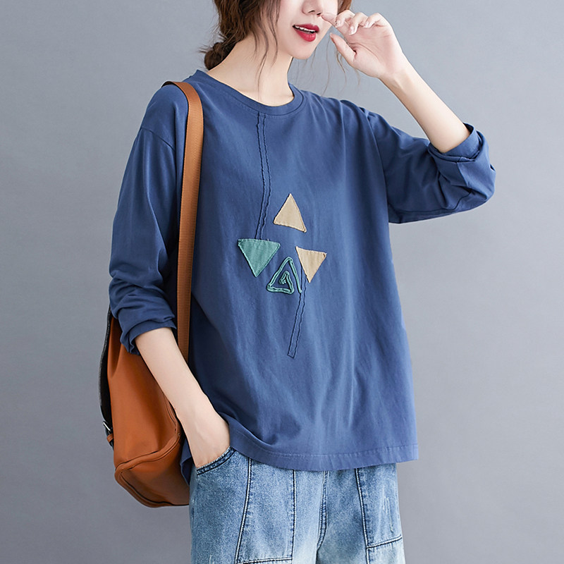 2024春季新款宽松长袖打底上衣女休闲百搭撞色圆领贴布大码T恤衫