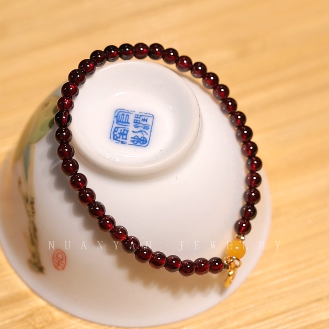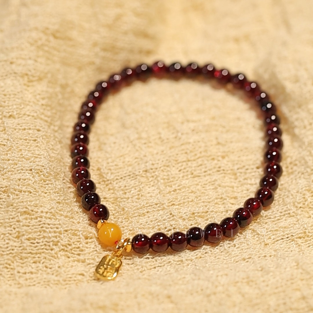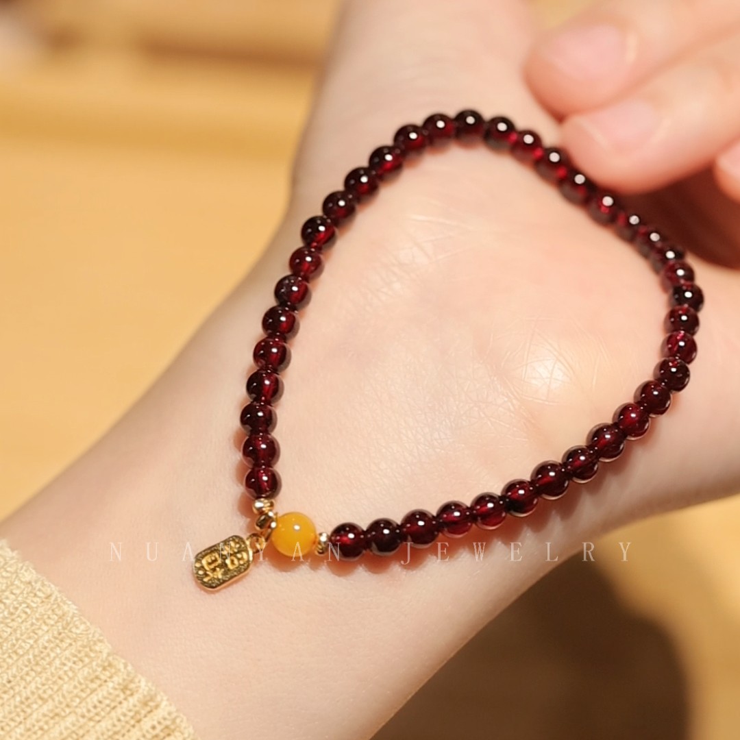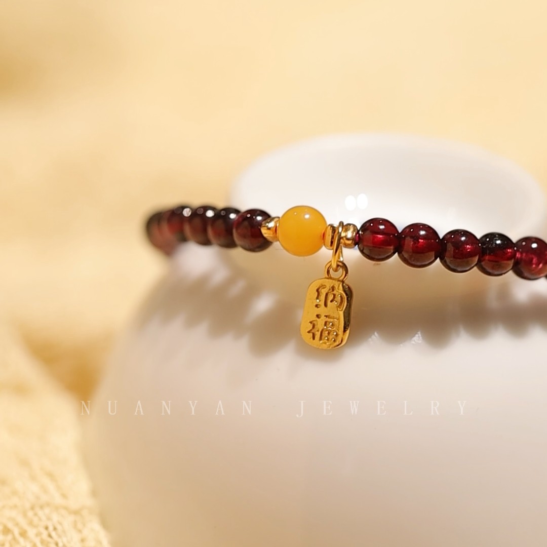 暖言单圈石榴石手链女小众设计蜜蜡转运珠纳福牌子吊坠石榴石手串