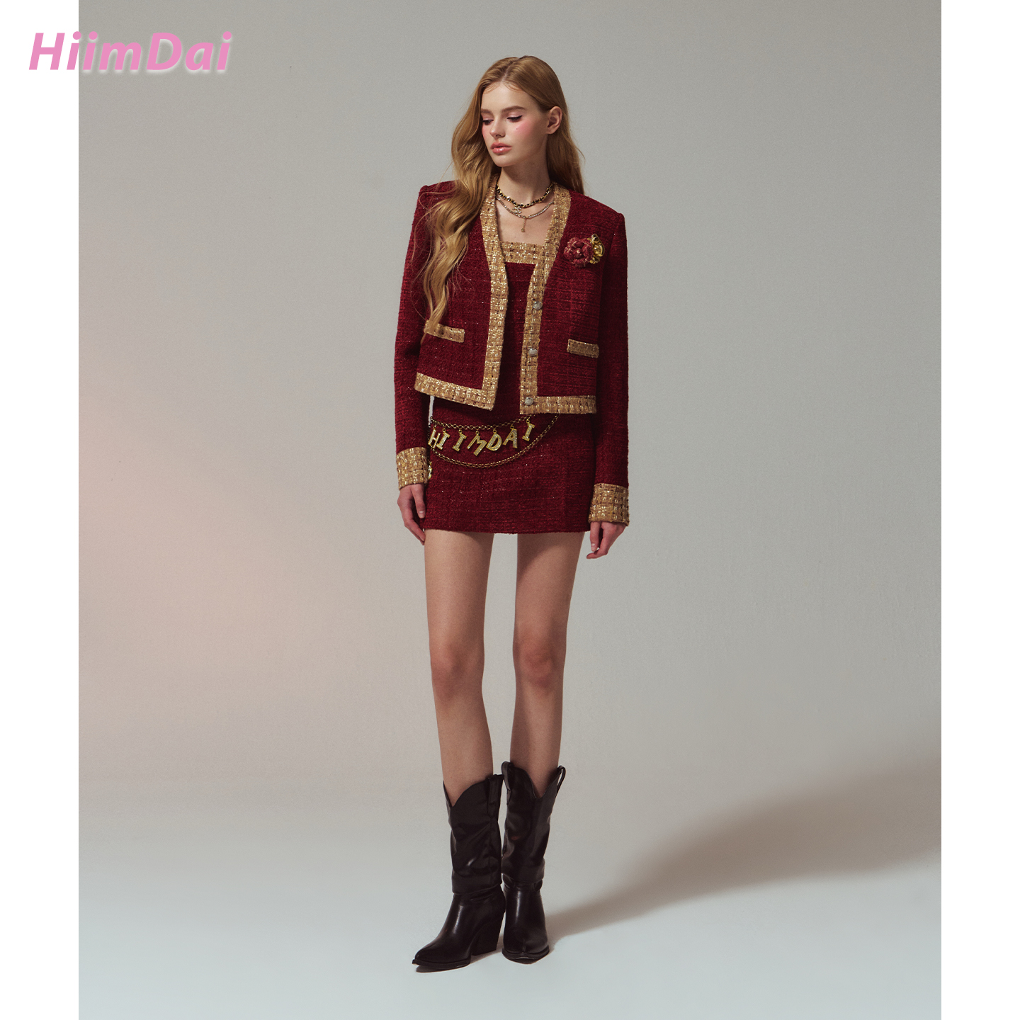 HiimDai 山茶花 璀璨异质拼接 千金感粗花呢小香风收腰抹胸连衣裙
