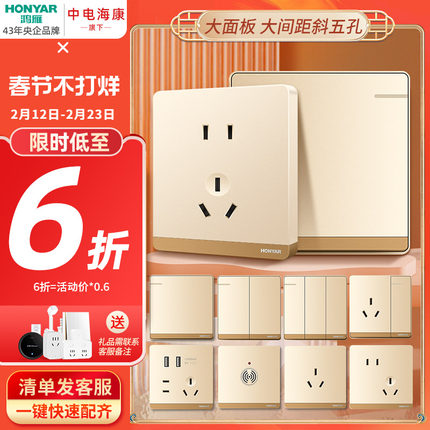 鸿雁开关插座面板86型五孔插座面板多孔家用墙壁暗装开关面板Q金