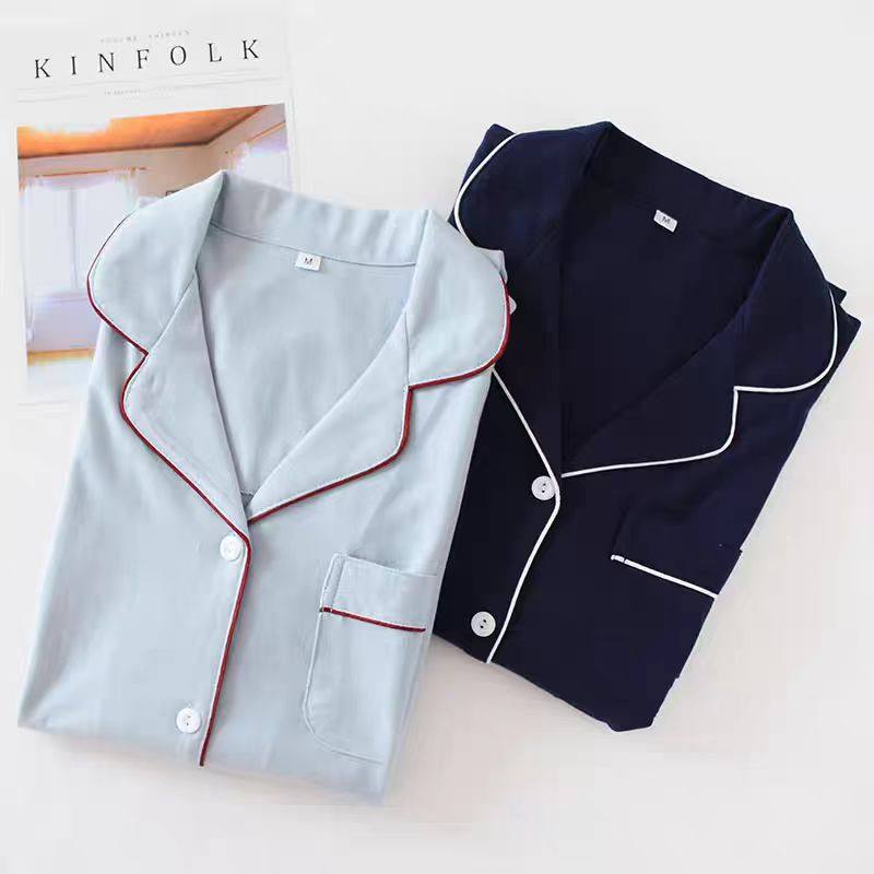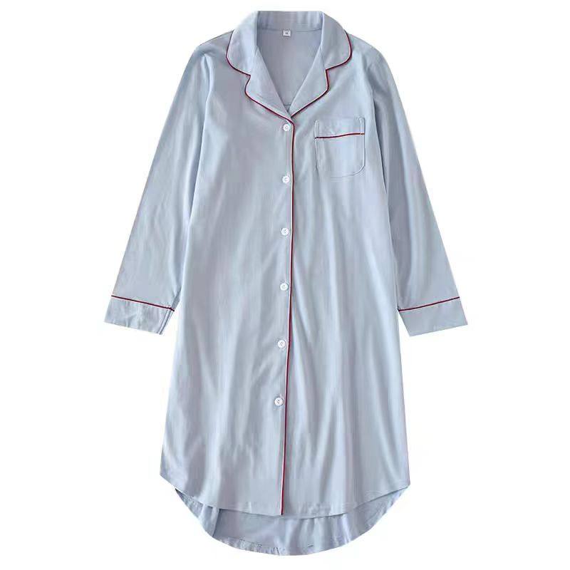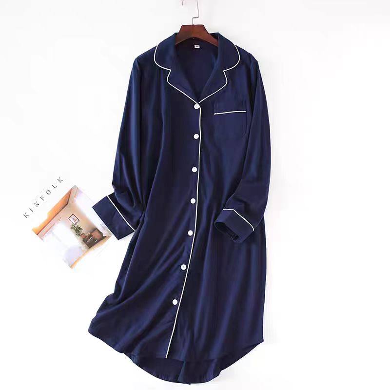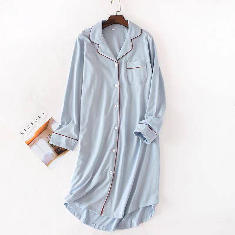 日系简约全棉针织长袖翻领睡裙女春秋季中长款燕尾睡袍纯色衬衫裙