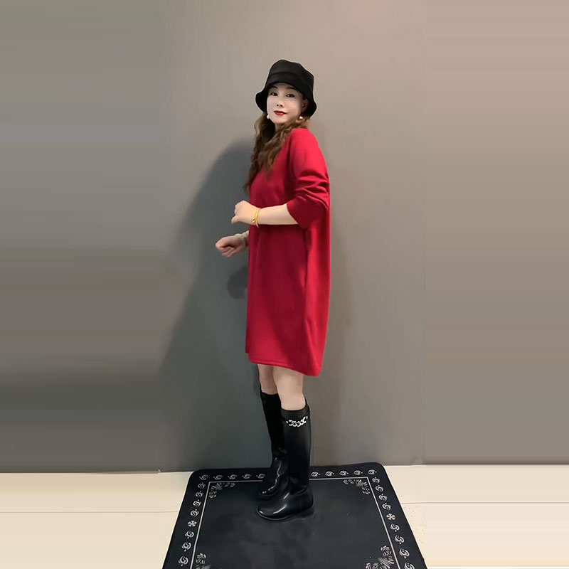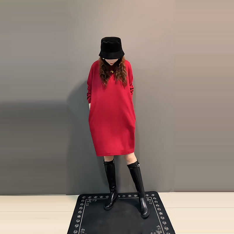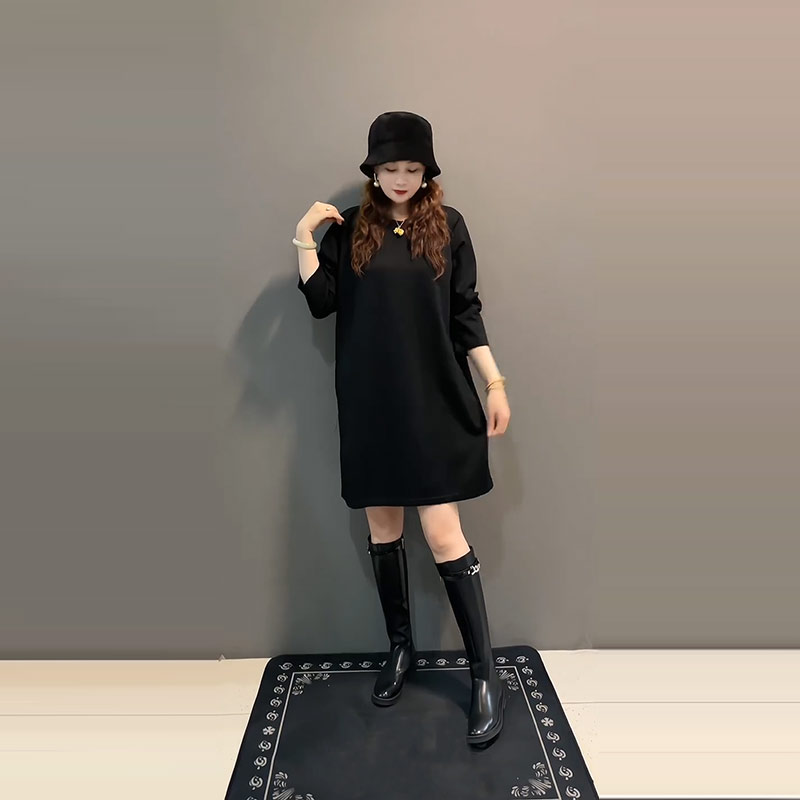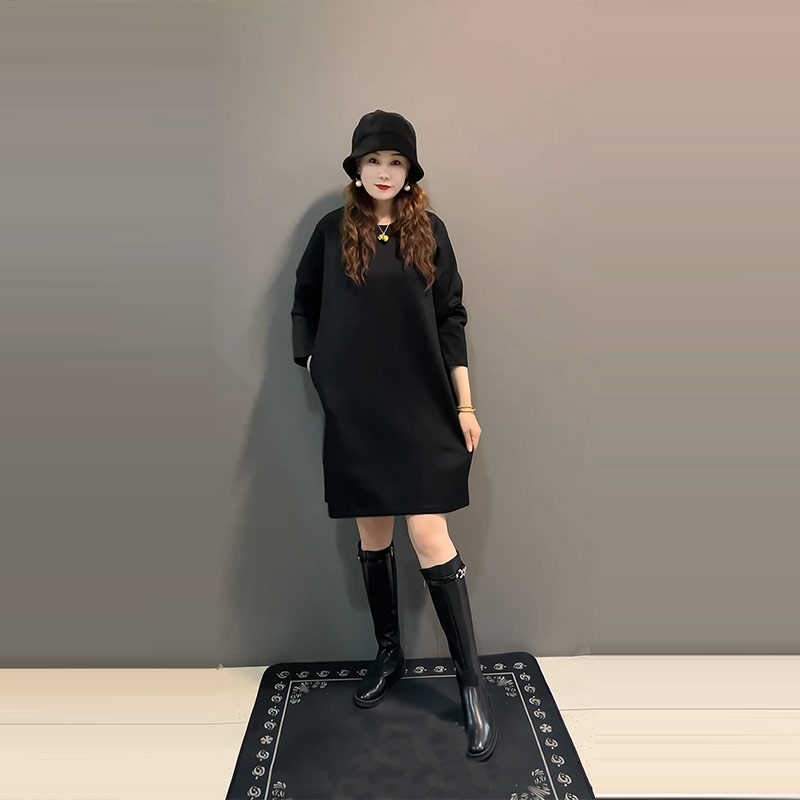 大码女装圆领净版中长款T恤裙胖MM纯色简约宽松长袖遮肚子连衣裙