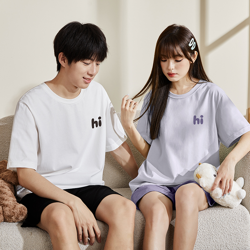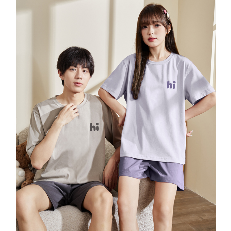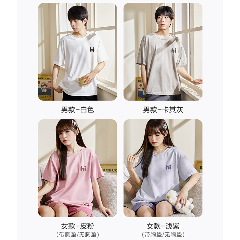 唐狮睡衣女夏季男短袖带胸垫一体情侣装一男一女宽松家居服套装女