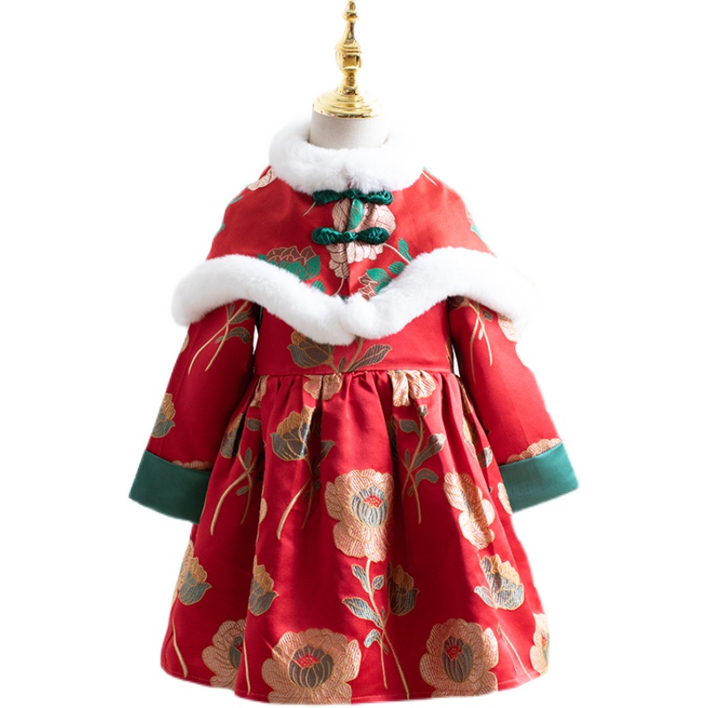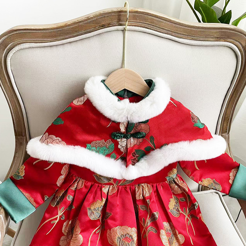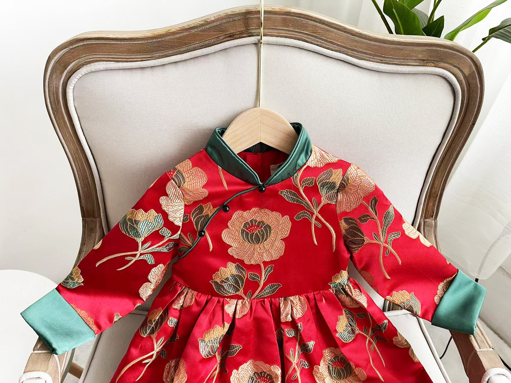 2024秋冬女童长袖中国风旗袍连衣裙红色儿童宝宝春节拜年服新年装