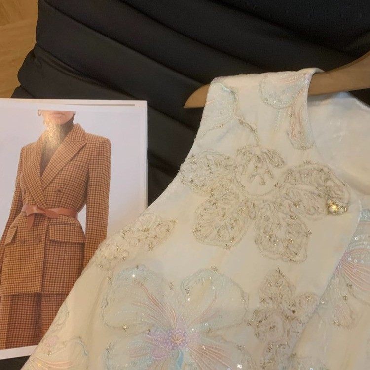 新中式重工刺绣羽毛马甲新款国风女圆领无袖外搭坎肩背心上衣