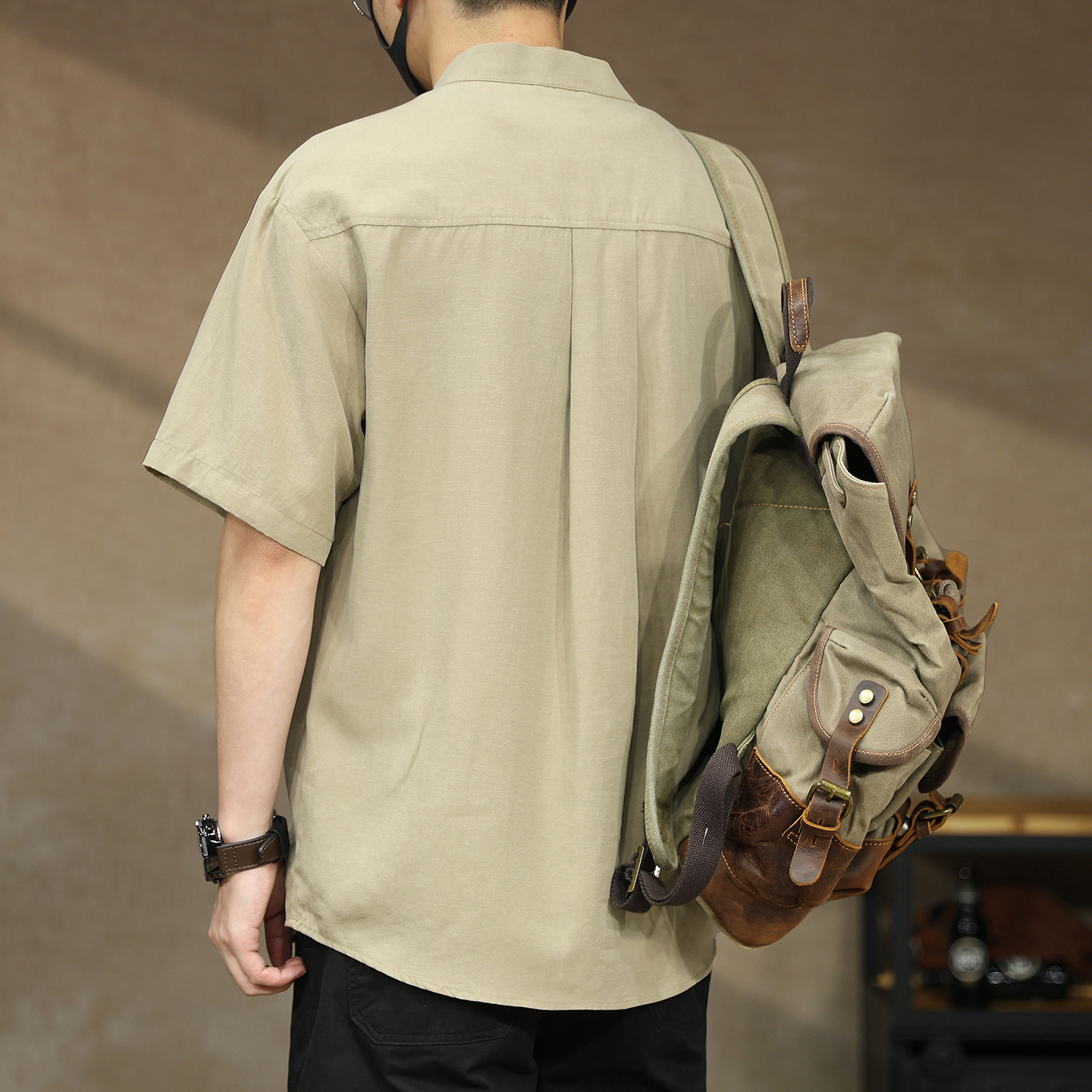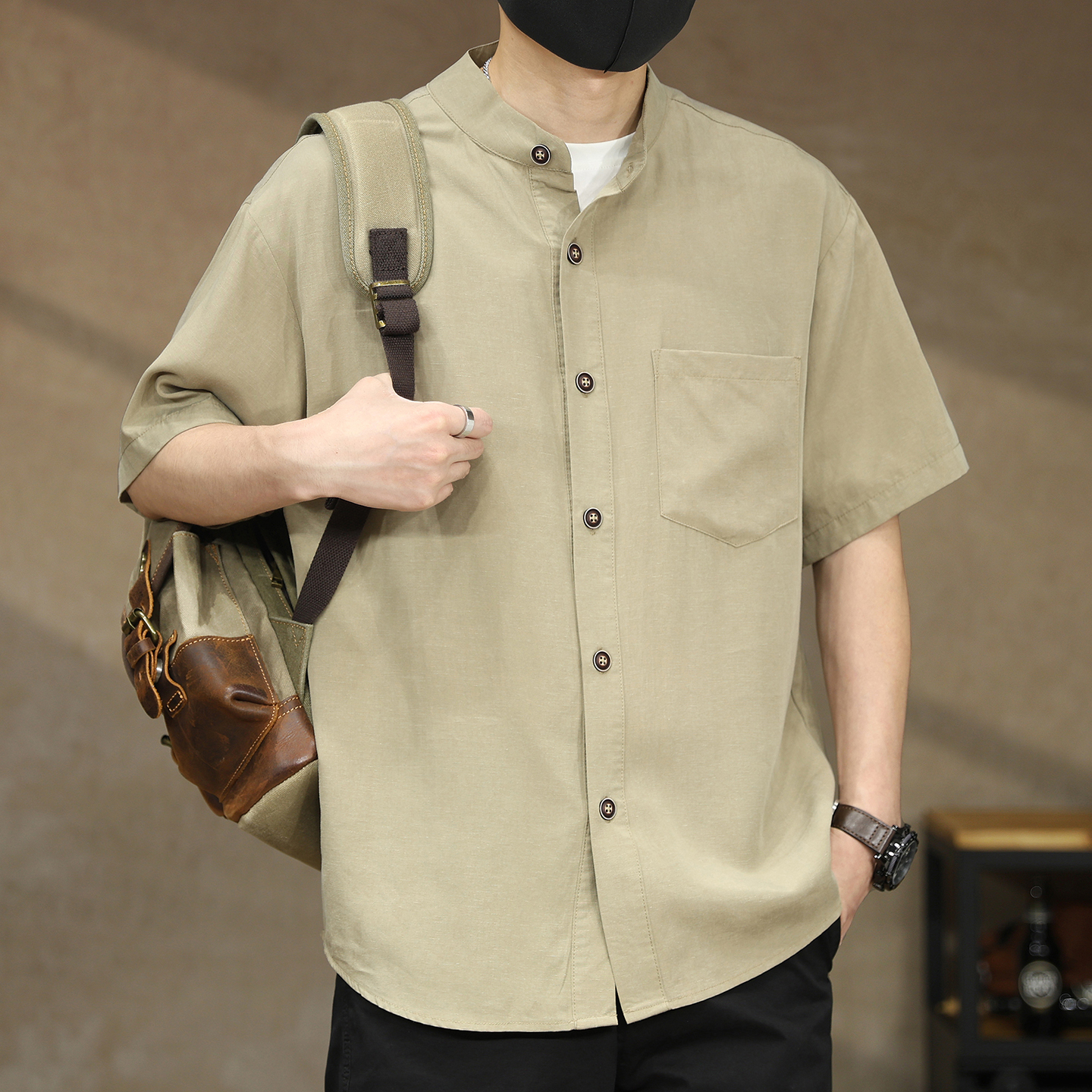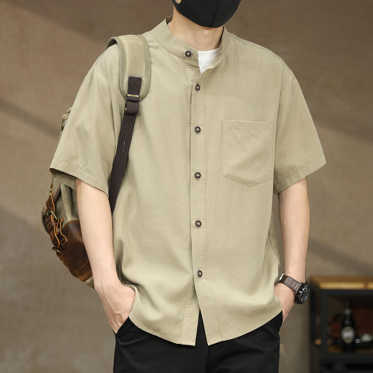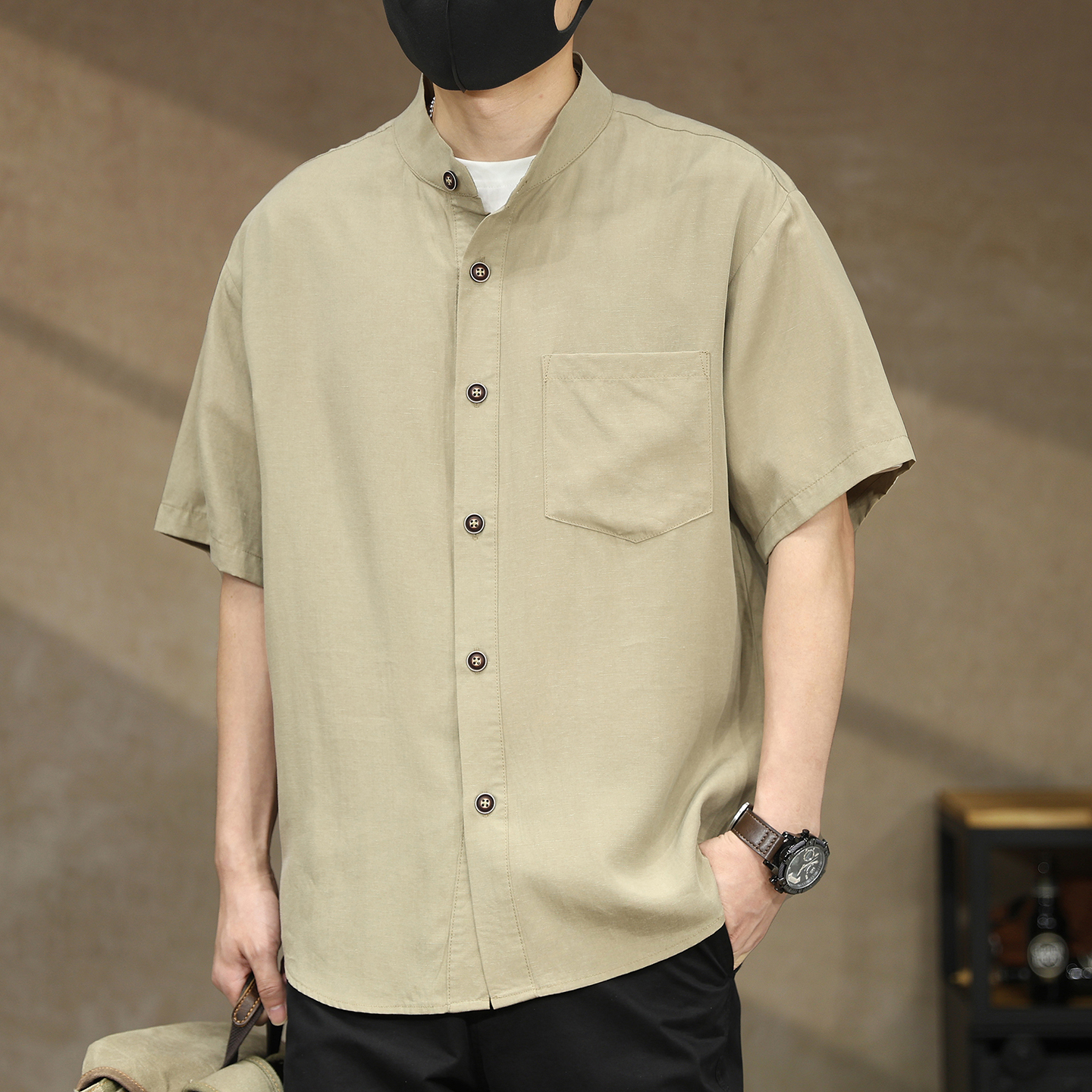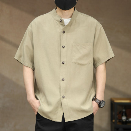 高端美式复古莱赛尔亚麻立领衬衫男士夏季轻熟风宽松衬衣短袖外套
